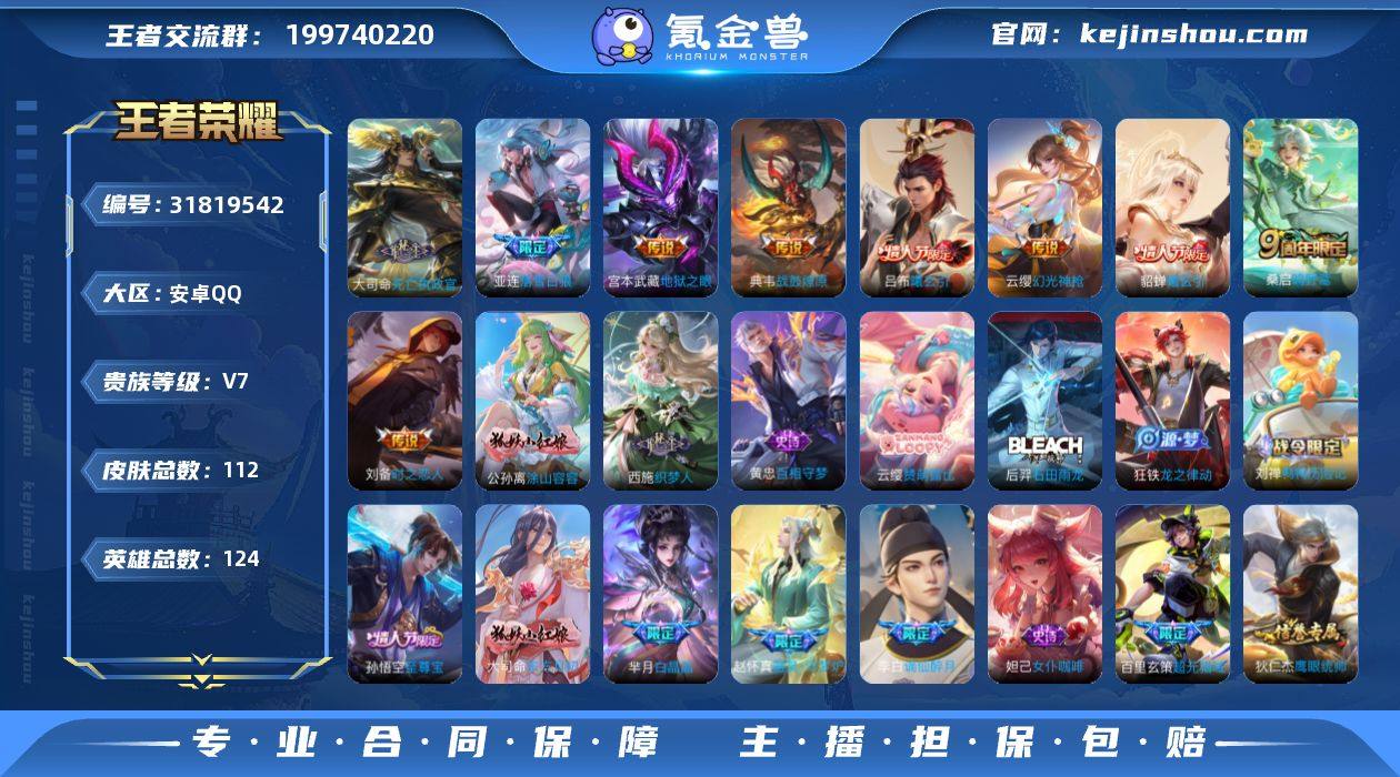 安卓Q-V7-永恒钻石III段位-124英雄-112皮肤-9传说-32史诗【英雄全皮】:孙权全皮,影全皮【传说皮肤】:大司命死亡执政官,云缨幻光神枪,桑启鸣野蒿,亚连落雪白狼,吕布曦玄引,貂蝉曦玄引,典韦战鼓燎原,刘备时之恋人,宫本武藏地狱之眼【限定皮肤】:姜子牙天穹之誓,李白谪仙醉月,狄仁杰阴阳师,赵云皇家上将,芈月白晶晶,狄仁杰魔术师,项羽海滩派对,孙悟空至尊宝,裴擒虎擒涛扼浪,鲁班大师探海日志,桑启海盐诗旅,张良古海寻踪,高渐离燃音魔法,妲己灵卜魔法,鬼谷子天穹祈灯,吕布曦玄引,貂蝉曦玄引,百里玄策超元猎域,亚连落雪白狼,沈梦溪龙舞盛年【赛季限定】:桑启海盐诗旅,裴擒虎擒涛扼浪,鲁班大师探海日志,张良古海寻踪,鬼谷子天穹祈灯,姜子牙天穹之誓,东皇太一噬灭天穹,太乙真人谧流熔炉,钟馗虚灵犬护,甄姬逆浪荇歌,亚瑟荣光之誓,牛魔星界战将【战令限定】:高渐离燃音魔法,妲己灵卜魔法,刘禅鸭鸭历险记,沈梦溪鸭鸭历险记【史诗皮肤】:公孙离涂山容容,西施织梦人,黄忠百相守梦,云缨赞萌露比,后羿石田雨龙,狂铁龙之律动,刘禅鸭鸭历险记,赵怀真器灵浮梦炉,牛魔星界战将,李白谪仙醉月,大司命东方月初,百里玄策超元猎域,高渐离燃音魔法,妲己灵卜魔法,哪吒雪上飞焰,钟馗乐园奇幻夜,芈月白晶晶,狄仁杰鹰眼统帅,孙策猫狗日记,白起星夜王子,亚瑟心灵战警,诸葛亮黄金分割率,兰陵王暗隐猎兽者,夏侯惇乘风破浪,刘邦德古拉伯爵,孙悟空至尊宝,妲己女仆咖啡,妲己魅力维加斯,嬴政摇滚巨星,孙尚香水果甜心,宫本武藏鬼剑武藏,狄仁杰魔术师,赵云皇家上将【其他皮肤】:孙权径山谋武,张良罗小黑战记,亚瑟荣光之誓,哪吒罗小黑战记,桑启青衿临川,鬼谷子克喵,莱西奥踏浪烽翎,甄姬逆浪荇歌,白起死霸装,姬小满小满鸭,露娜命运加冕,沈梦溪鸭鸭历险记,...