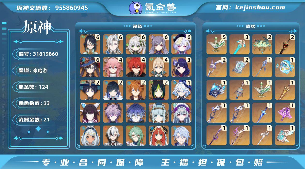 龙王6+1 闲云6+2 草神6+6 满命莫娜 满命77 满命刻晴,两命夜兰,三命雷神,一命水神。五个成型队伍爽玩,1.最新月感电队,2.龙王队 3.草神激化队 4.闲云下落重击队 5.3命雷神队 未绑定邮箱可放心