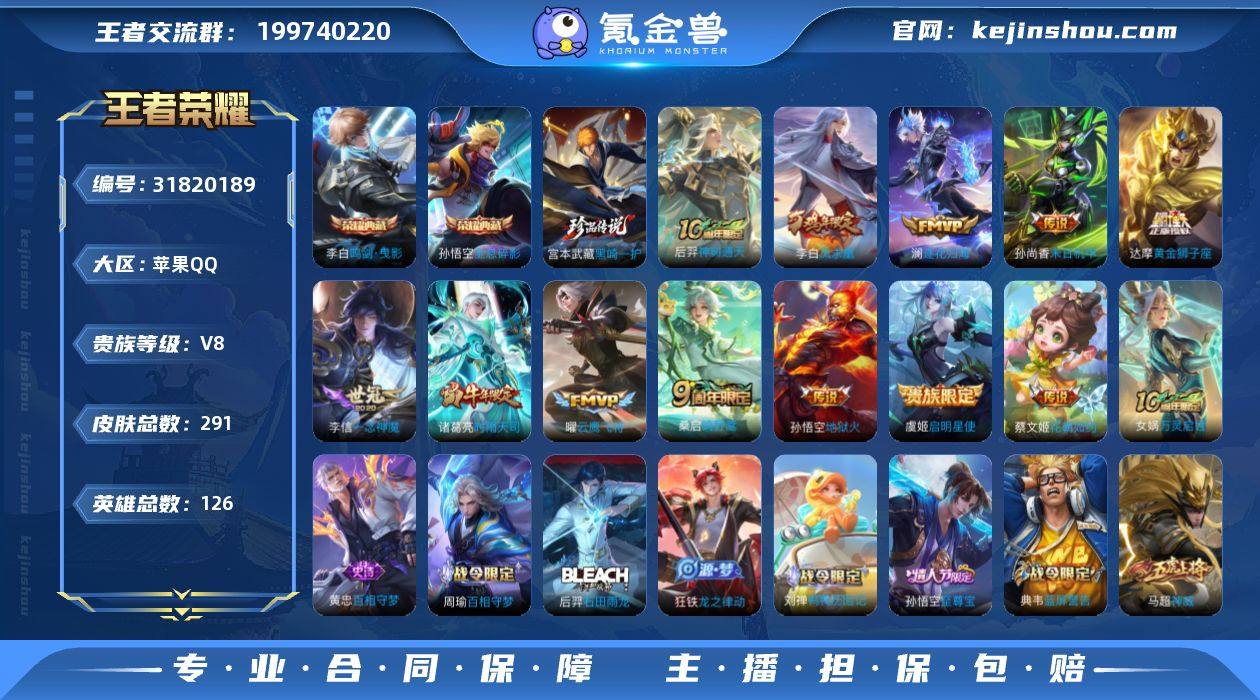 DAS5599-苹果Q-V8--126英雄-291皮肤-2典藏皮肤-1珍品传说-12传说-81史诗 【英雄全皮】:狂铁全皮,猪八戒全皮,蒙恬全皮 【荣耀典藏】:孙悟空全息碎影,李白鸣剑曳影 【珍品传说】:宫本武藏黑崎一护 【传说皮肤】:后羿神树通天,桑启鸣野蒿,澜逐花归海,蔡文姬花朝如约,诸葛亮时雨天司,虞姬启明星使,曜云鹰飞将,李信一念神魔,达摩黄金狮子座,李白凤求凰,孙尚香末日机甲,孙悟空地狱火 【限定皮肤】:狄仁杰阴阳师,赵云皇家上将,嬴政优雅恋人,孙尚香蔷薇恋人,鲁班七号狮舞东方,庄周高山流水,高渐离死亡摇滚,阿轲迷踪丽影,钟无艳超时空战士,白起夜都怪侠,芈月幻夜卜梦,吕布御风骁将,周瑜赤莲之焰,元歌云间偶戏,夏侯惇朔风刀,甄姬落雪兰心,典韦蓝屏警告,马可波罗暗影游猎,狄仁杰魔术师,狄仁杰万华元夜,达摩星际陆战队,达摩沙漠行僧,项羽海滩派对,老夫子醍醐杖,关羽冰锋战神,安琪拉魔法小厨娘,程咬金演武夺筹,刘邦夺宝奇兵,王昭君午后时光,兰陵王驯魔猎人,兰陵王金庭之子,亚瑟潮玩骑士王,孙悟空至尊宝,孙悟空大圣娶亲,牛魔御旌,李元芳银河之约,李元芳云中旅人,虞姬启明星使,钟馗神迹守卫,钟馗驱傩正仪,女娲朔望之晖,雅典娜单词大作战,雅典娜黎明之约,蔡文姬繁星吟游,鬼谷子原初探秘者,鬼谷子五谷丰年,诸葛亮时雨天司,黄忠烈魂,黄忠火炮绅士,苏烈千军破阵,百里玄策原初追逐者,弈星混沌棋,梦奇顽趣,沈梦溪星空之诺,沈梦溪大漠名商,明世隐疑决卦,明世隐吟游魔法,裴擒虎李小龙,裴擒虎擒涛扼浪,狂铁御狮,狂铁电玩高手,米莱狄御霄,米莱狄胡桃异想国,云中君纤云弄巧,盾山御銮,猪八戒西部大镖客,猪八戒猪悟能,上官婉儿梁祝,嫦娥拒霜思,嫦娥暖冬兔眠,西施玲珑珍味,蒙犽狂想玩偶喵,鲁班大师探海日志,桑启海盐诗旅,暃星界游侠,张良古海寻...