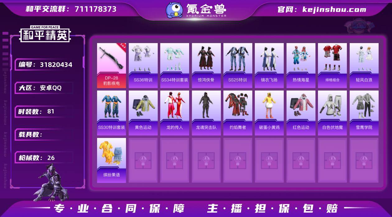 qz201-q皇冠等级71-SVIP8-1特效枪-5810热力值-18套装-26枪皮【稀有武器皮肤】: AWM-纯真浪花 汤姆逊-纯真浪花 DBS-乌木金纹 平底锅-纯真浪花 Mk14-冰河战士 M16A4-冰河战士 AKM-龙的传人 SCAR-L-炫彩节奏 SCAR-L-甜蜜旋律 M16A4-幻世战舞者 M762-天降萌叽 M200-惊鸿侠骨 SKS-炫彩节奏 M417-惊鸿侠骨 UZI-幻影战神 Vector-治愈之星 P90-乌木金纹 S12K-玩趣呆呆 DP-28-甜蜜旋律 MG3-惊鸿侠骨 平底锅-惊鸿侠骨 爆炸猎弓-惊鸿侠骨 Kar98K-顶峰精英 SPAS-12-乌木金纹 Mini14-香桃花海【其他套装】: 龙魂突击队 SS30特训 龙的传人 红色运动 黄色运动 白色伏地魔 绯格组合 热情海星 雪鹰学院 惊鸿侠骨 灼焰舞者 破蛋小黄鸡 轻风白浪 缤纷果语 SS25特训 锦衣飞扬【优质降落伞】: 月下萌萌兔降落伞 普通降落伞 化学天才降落伞 闻鸡启五降落伞 惊鸿侠骨降落伞 破晓战