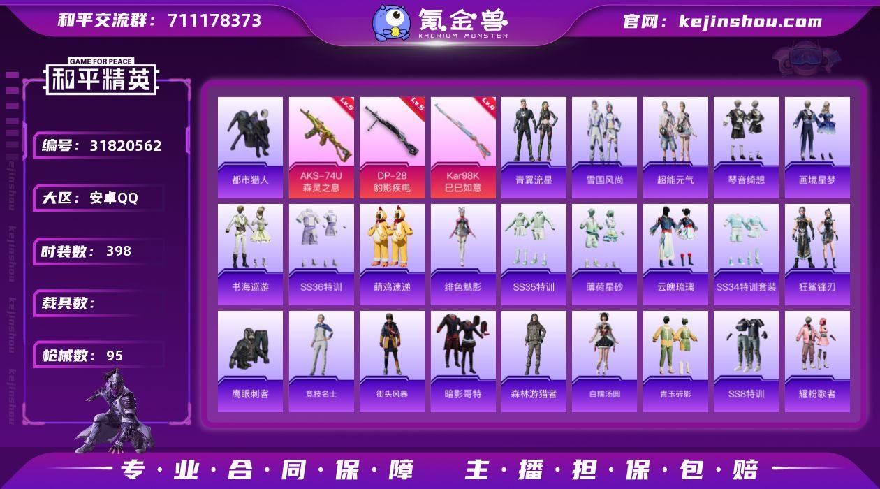 安卓 手Q-5粉装-3特效枪-0载具-1粉色飞行器-65424热力值-14王牌印记-159套装-210枪皮 【热门品类】:套装-龟仙人 【粉色套装】:粉装-海盐物语,粉装-霁雪冰心,粉装-第五大道,粉装-未来歌姬,粉装-雪月幻音 【粉色枪皮等级】:SCAR-L-青春物语(七级),Kar98K-巳巳如意(五级),DP-28-豹影疾电(五级) 【粉色枪皮】:SCAR-L-青春物语,Kar98K-巳巳如意,DP-28-豹影疾电 【粉色飞行器】:萌物绒绒飞行器 【粉色降落伞】:海渊国主降落伞,绒雪飘舞降落伞,垂柳戏鸭降落伞,彩虹甜喵降落伞,第五大道降落伞,飒粉甜心降落伞,蜜语绒猫降落伞,临安公主降落伞,雪月幻音降落伞,冷漠罗丽降落伞 【稀有套装】:套装-龟仙人,套装-巳巳如意,套装-雏菊兔兔,套装-萝兰蝴蝶,套装-小熊娃娃,套装-糖糖葫芦,套装-青团波波,套装-棉花软糖,角色-摩登魅猫,套装-燕燕于飞,套装-鱼渊荷华,套装-风舞幻音,套装-蓝冰羽,角色-时希公主,角色-乐音,套装-朱霞炽焰,套装-凌霄紫焰 【稀有枪皮】:AKM-夜灯,AKM-奇异狩猎者,AKM-彩虹符号,AKM-影袭,AKM-萌趣颜团子,AKM-虎虎生威,AKM-霓虹街区,M16A4-幻世战舞者,M16A4-甜心亚梦,M16A4-红色方程式,M16A4-蓝色火焰,SCAR-L-暗夜玫瑰,SCAR-L-炫彩节奏,SCAR-L-玉兔迎春,SCAR-L-红色方程式,M416-夜灯,M416-糯团青竹,M416-红色方程式,GROZA-异彩先驱,GROZA-彩虹符号,GROZA-影袭,GROZA-懵萌河马,GROZA-田园牧歌,AUG-天降萌叽,QBZ-彩虹符号,M762-天降萌叽,M762-奇异狩猎者,M762-彩虹符号,M762-瑞龙福将,M762-第五大道,M762-绒雪飘舞,Mk47-妙红点点,Mk47-炫光之旅,G36C-懵萌河马,G36C-时空追击者,AC-VAL-天降萌叽,AC-VAL-彩虹甜喵,AC-VAL-快闪甜心,AC-VAL-甜心亚梦,蜜獾-天降萌叽,蜜獾-娇憨猪猪,ARX-凌霄紫焰,UZI-天降萌叽,UZI-娇憨猪猪,UZI-...