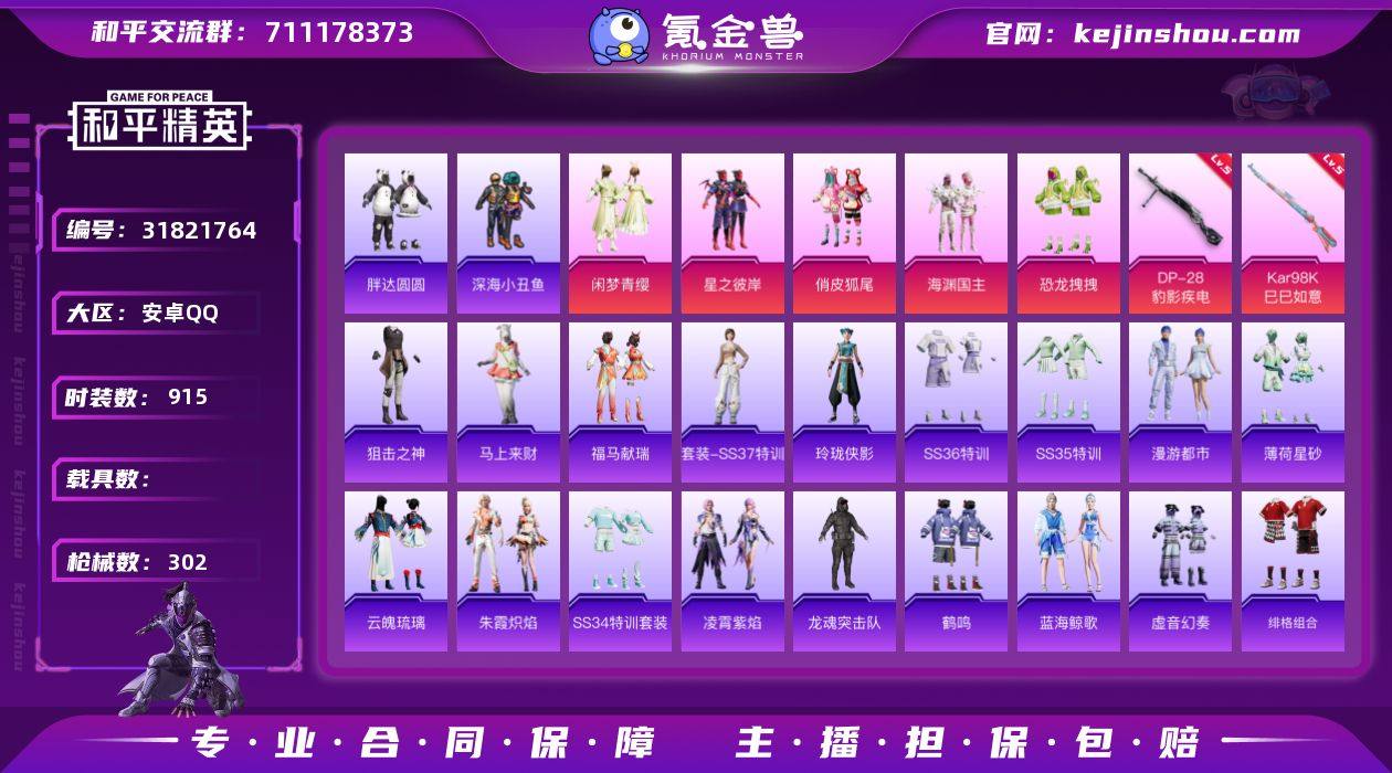 实名:可二次实名 是否支持人脸包赔:支持 粉装数量:5 特效枪数量:2 时装数:915 枪械数:302 胖达圆圆,深海小丑鱼 海渊国主,恐龙拽拽,俏皮狐尾,闲梦青缨,星之彼岸 五级DP-28-豹影疾电,五级Kar98K-巳巳如意 狙击之神,马上来财,福马献瑞,SS37特训,玲珑侠影,SS36特训,SS35特训,漫游都市,薄荷星砂,云魄琉璃,凌霄紫焰,SS34特训套装,朱霞炽焰,Alan Walker电音教主,暗夜契约,冰川格斗者,冰川特警,暴风机械师,北国孤狼,白光莹,滨海厨神,滨海假日,冰河战士,爆裂葡萄,白糯汤圆,白色伏地魔,贝斯之夜,白熊同盟,白月香洋装,春光漫游,彩虹兔,初火先锋,长空猛禽,潮流炫酷,潮流游乐家,传奇侦探,蝶变,大橘大利,大橘为重,都市魅力,都市漫游者,飞驰魅影,菲菲,绯格组合,风华少年志,飞狐塔尔斯,粉红小猪,疯狂小兔子,福星高照,飞行日记,格斗先锋,诡谋托雷基亚,龟仙人,光之冒险,幻彩翩翩,海岛探路者,鹤鸣,虎虎生威吉莉,湖蓝色名流,黑色伏地魔,黄色伏地魔,灰色格斗者,黄色名流,海上生明月,黄色运动,红色运动,幻世战舞者,浑天鲲鹏,幻羽潜行,幻影武者,绝对偶像,极地朋克,金戈铁马,酒红色名流,惊鸿侠骨,橘黑制服,娇憨猪猪,竞技达人朋克,击剑大师,竞技名士,竞技勇士朋克,吉莉礼服,坚韧舞者,极速红龙,极速竞梦,金鼠迎春,街头潮人,机械英豪,机械征服者,军械专家,锦衣飞扬,酷潮明星,空岛之星,科技之星,快乐星愿,快闪甜心,空投萌叽,蓝彩潮人,龙的传人,蓝海鲸歌,龙魂突击队,猎鹰,冷酷挑战者,六六大吉,浪漫波比,猎梦纪元,灵蜜圈圈,镭射皇者,蓝色运动,蓝甜马卡龙,冷血极客,恋语绒绒,冷焰舞者,猛禽,玫瑰恋情,妙红点点,萌黄之夏,魅力单车,麻辣教官,懵萌河马,梦起落英,萌趣咩咩,萌趣颜团子,明鸳圣池,弄潮海豚,暖风夏荷,逆风勇士,霓虹极客,霓虹街区,怒火燎原,柠萌假日,牛气冲天,牛气满满,破蛋小黄鸡,胖达圆圆,PEL躁动竞梦者,破晓战魂,青春冒险家,绮丽涂鸦,青年教官,青涩年华,青涩时光,千禧之恋,青玉碎影,云朵鹅,瑞龙福将,人气偶像,热血青春,软羊咩咩,日照花林,丝绸行者,深海梦境,深海小丑鱼,山经魅狐,闪金天王,时空追击者,深蓝色名流,神气柴柴,SS11特训,SS12特训,SS13特训,SS14特训,SS15特训,SS16特训,SS17特训,SS18特训,SS19特训,SS20特训,SS21特训,SS22特训,SS23特训,SS24特训,SS25特训,SS26特训,SS27特训,SS28特训,SS29特训,SS30特训套装,SS31特训套装,SS32特训套装,SS33特训套装,SS8特训,SS9特训,巳巳如意,探宝勇士,甜蜜告白,甜蜜熊情侣,甜梦熊熊,涂山之恋,特训学院,甜心亚梦,团圆交子,特种颜团子,特战装甲,完美偶像,王牌教练,微雨春柳,小丑鱼,迅捷狂鲨,迅捷之星,炫蓝之夏,许七安,雪绒豹,旭日情侣,夏日音浪,雪山精英,玄武圣者,虚音幻奏,银白舞王,原初圣火,异彩先驱,跃动心情,耀粉歌者,银河圣歌,元气发射,音速流光,影双刃,夜瞳黯灵,玉兔迎春,野性战心,焰鹰斗篷,鱼渊荷华,幽夜迷踪,耀眼新星,燕燕于飞,战地督导,智慧之神,智谋强哥,众神之王,灼焰舞者,治愈之星 炫彩糖果飞行器,萌物绒绒飞行器,神秘黑猫飞行器,万象金身飞行器,垂柳戏鸭降落伞,第五大道降落伞,繁花小夜曲降落伞,繁龙极客降落伞,绯穹魔姬降落伞,江南烟雨降落伞,绝色倾城降落伞,龙行天下降落伞,盛世惊鸿降落伞,圣堂之誓降落伞,炫紫旋律降落伞,星之信仰降落伞,庄