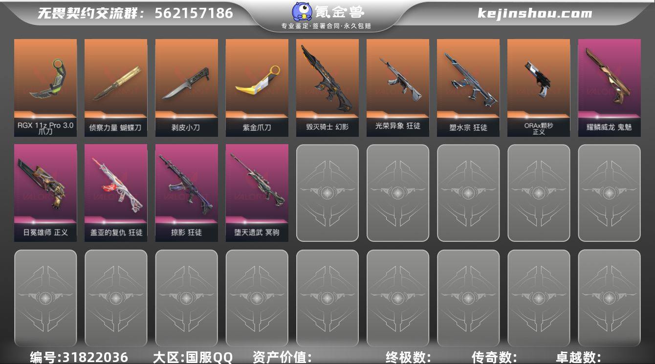 皮肤资产价值:26820 已用源晶点数:930 匕首-超限闪存 爪刀-RGX 11z Pro 3.0 定海神珍-盖世英雄,荒土机兵热能刀,神圣领域 战刀 未来开拓者-西部未来 幻影-RGX 11z Pro//2.0,狂徒-光明哨兵,狂徒-奇点//2.0,戍卫-掠影,狂徒-紫阙金琅,狂徒-掠影,幻影-超限闪存,幻影-纳米打击,幻影-神圣领域,狂徒-荒土机兵,獠犬-模拟赫兹,獠犬-神圣领域,戍卫-浮光跃金,戍卫-逆冲蛮牛,戍卫-月球哨兵 蜂刺-超限闪存,骇灵-浮光跃金,骇灵-荒土机兵,骇灵-星云暗涌 奥丁-纳米打击,战神-浮光跃金,战神-神圣领域 冥驹-离子武器,冥驹-荒土机兵,冥驹-模拟赫兹,莽侠-超限闪存,莽侠-月球哨兵 西部未来 正义,正义-奇点,鬼魅-盖亚的复仇,标配-阿特拉斯指挥部,标配-超能偶像,标配-浮光跃金,标配-荒土机兵,标配-星际猎兵,鬼魅-诡秘蛇影,鬼魅-幻心猎手,鬼魅-模拟赫兹,鬼魅-星云暗涌,狂怒-逆冲蛮牛,狂怒-神圣领域,蒙太奇 狂怒,正义-超限闪存,正义-纳米打击,正义-日耀风暴,正义-月球哨兵 雄鹿-紫阙金琅2.0,判官-纳米打击,雄鹿-模拟赫兹,雄鹿-逆冲蛮牛,雄鹿-月球哨兵 Clutch卡面,分崩离析卡面,无畏契约GO!第一卷:零卡面,无畏契约GO!第一卷:芮娜卡面,梦幻奶茶卡面,势不可挡芮娜卡面,势不可挡星礈卡面,双城之战拥抱卡面,声感陷阱设计图卡面,像素瞬间:深海明珠卡面,铁之华卡面,VCT25xTL卡面,无畏契约吉祥物卡面,无畏契约暮蝶卡面,我眼中的世界卡面,最高舞台卡面,终章:生意人麦宝卡面 卖家说:现在超凡