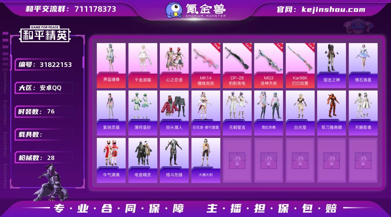 实名:可二次实名 是否支持人脸包赔:支持 粉装数量:3 特效枪数量:4 时装数:76 枪械数:28 霁蓝缠春,千金淑猫,心之恋语 五级MK14-樱桃泡泡,三级DP-28-豹影疾电,三级Kar98K-巳巳如意,三级MG3-洛神天依 狙击之神,瑰石海星,紫俏灵猫,薄荷星砂,白光莹,大橘大利,电音精灵,格斗先锋,军刀雅典娜,街头潮人,狂花道·娜可露露,霓虹热舞,牛气满满,天籁歌者,无暇誓言 炫彩糖果降落伞,异瞳寒姬降落伞,金丰海韵降落伞,橘柚倾心降落伞,萌酷奶龙降落伞,拳皇·狂花道降落伞,圣堂之誓降落伞,闲梦青缨降落伞 卖家说:连体号带个王者荣耀需要可以咨询