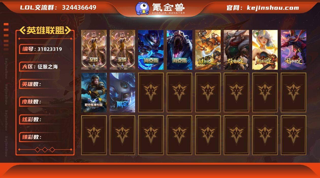 未定级段位-172英雄-425皮肤-290炫彩-1终极-16神话-76限定-41传说-60史诗 【神话皮肤】:十周年纪念安妮,源代码乐芙兰,殿堂传奇乐芙兰,神凰行者瑞羽圣凰艾尼维亚,海克斯科技安妮,海克斯科技克格莫,至臻至高天凯尔,至臻绝息圣堂厄运小姐,至臻墨之影武者亚索,至臻神凰行者烈羽焰凰霞,至臻月蚀骑士赛娜,至臻玉剑传说武剑仙 【热门头像】:卡特琳娜的匕首头像,银河魔装机神安妮头像 【至臻皮肤】:至臻至高天凯尔,至臻绝息圣堂厄运小姐,至臻黑色玫瑰假面舞会卡特琳娜,至臻剪纸仙灵卡西奥佩娅,至臻玉剑传说武剑仙锐雯,至臻墨之影武者亚索,至臻月蚀骑士赛娜,至臻灵魂莲华劫,至臻神凰行者烈羽焰凰霞,至臻莲华温泉厄斐琉斯 【臻彩皮肤】:天龙之子卡莎飞龙乘云,无畏骑士瑟庄妮赤子初心,墨之影武者亚索金墨耀影,幻灵白鸽萨勒芬妮梦幻强袭,花仙子拉克丝纹白,青花瓷艾瑞莉娅月色,霸天战士雷恩加尔星啸天火,霸天异形卡兹克掠空魅影,天煞劫恒星游历者,星之守护者金克丝黑洞,西部天使赛娜贝利尔之怠,玉剑传说苍鸾丁香,殿堂传奇乐芙兰登神,春晖神女艾希玉露金风,咖啡甜心格温酒醉樱桃,战斗学院盖伦不死鸟,魔女阿卡丽虚荣,净雪之月莫甘娜冬虹,水晶玫瑰迦娜甜蜜花蕾 【年限皮肤】:紫金罗刹莫甘娜,玉净夜叉凯特琳,张辽文远,虎痴之拳蔚,金猪烈焰瑟庄妮,烈焰美人薇恩,王国机神苍狼瑟提,福牛守护者厄斐琉斯,福牛守护者嘉文四世,龙腾虎跃瑟提,天龙之子易,天龙之子伊泽瑞尔,天龙之子黛安娜,天龙之子卡莎,天龙之子斯莫德,点心宝贝阿木木,龙马烈焰波比 【海克斯皮肤】:海克斯科技安妮,海克斯科技克格莫 【情人节限定】:甜心宝贝安妮,甜心宝贝娑娜,甜心之羽霞,觅心猎手薇恩,觅心之翼奎因,觅心魔灵奥莉安娜 【冰雪限定】:圣诞开心鬼提莫,圣诞糖果棒厄运小姐,圣诞狂欢基兰...
