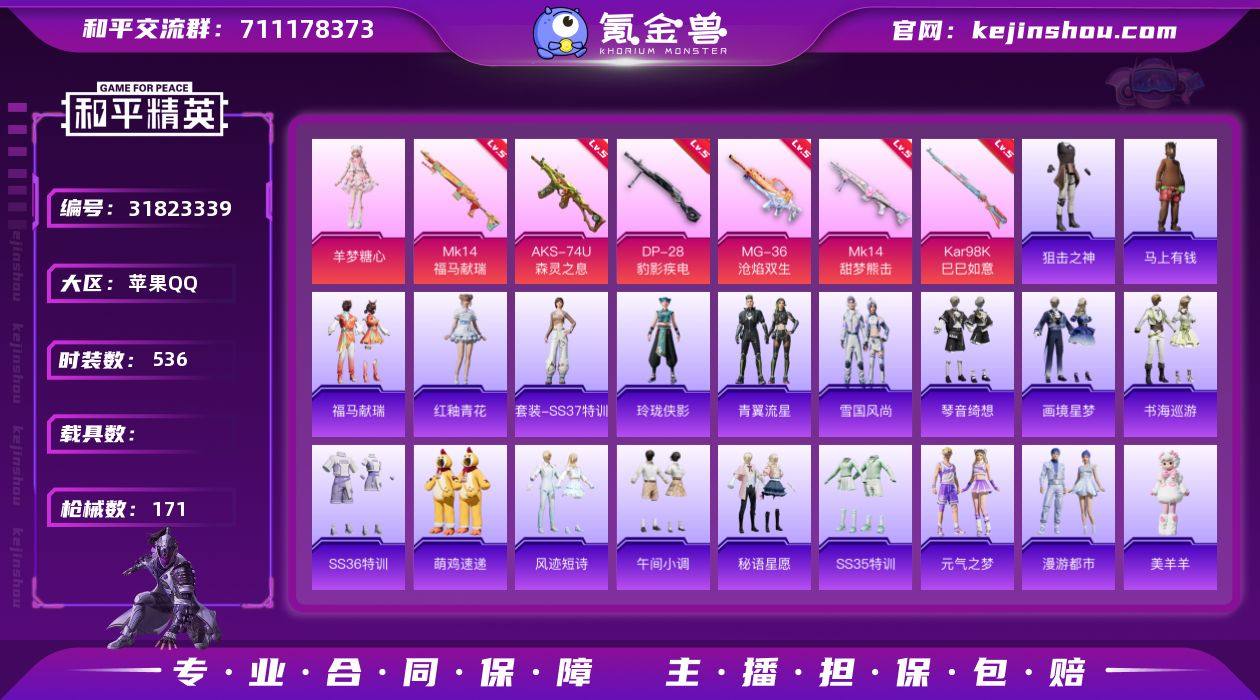 精氪素材号/粉丝logo标【羊梦糖心/暗影哥特/浪漫天命】美羊羊/战队服/满级mk14/小熊背包/地铁42点天赋 实名: 可修改 时装数: 536 枪械数: 171 战备数: 130 热门装扮: 羊梦糖心 稀有枪皮: Kar98K-巳巳如意,MK14-甜梦熊击,DP-28-豹影疾电,MG-36-沧焰双生,AKS-74U-森灵之息