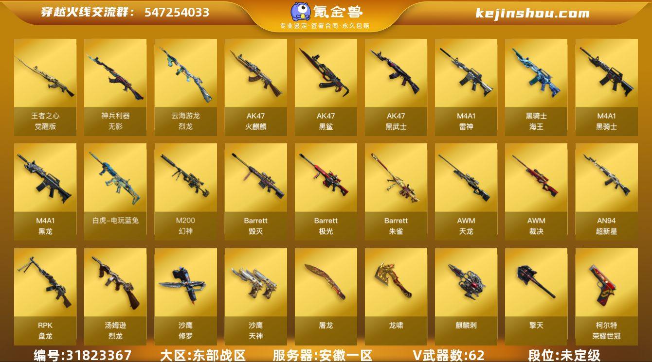 安徽一区-84V-22王者武器数-1炫金武器数 【热门武器】:M200-幻神,死亡之眼,荣耀世冠-火麒麟,荣耀世冠-雷神,白虎-电玩蓝兔,荣耀世冠-柯尔特,M4A1-黑骑士,汤姆逊-烈龙*7,RPK-盘龙*6,加特林-炼狱*4,斯泰尔-蝴蝶,沙鹰-修罗,黄金猫猫手套-白鲨,金刚伞 【王者炫金武器】:炫金骑士 【音效卡】:屠龙-云海游龙音效卡,M200-幻神音效卡,AK47-火麒麟音效卡,M4A1-雷神音效卡,M4A1-黑骑士音效卡,Barrett-毁灭音效卡,Barrett-毁灭-云海游龙音效卡 【皮肤】:幻神-周瑜皮肤,雷神-暗月,雷神-荣耀之魄,雷神-星空,雷神-荣耀世冠AG,雷神-动感闪耀 皮肤,火麒麟-荣耀世冠AG,火麒麟-心动糖果,毁灭-风暴,黑骑士耀金皮肤,战神-流金岁月皮肤*2,AK47-B-常胜将军-曹操,极光-能量核心 【角色】:葵,樱,王者-瞳-闭月羞花,王者之瞳,王者春,乔伊教练,云海玲珑,暗夜-X,风暴女,嘉年华灵狐,葵-赛博朋克,兰-新年限定,灵动武士,零-水下丽影,灵狐者-X,灵狐者-职业经理,麻雀,潘多拉-X,邱刚敖,斯沃特-X,蜀雪,铁骑荣耀,兔囡囡,新娜塔莎,雪莉杨-摸金校尉,樱-青春偶像,影武者-X,幽 【人偶武器】:斯泰尔-蝴蝶,AWM-灵狐-15周年嘉年华,迷你生化手雷,迷你超能女侍,灵狐娃娃手雷 【暴走生化】:死亡之眼,超级对讲机 【挑战大师】:冰龙粉碎者-白马银枪,激光毁灭者III*2,神圣爆裂者-末日III 【英雄级武器】:AK47-火麒麟*2,M4A1-黑龙,M4A1-雷神*3,M4A1-黑骑士,AK47-黑武士,AN94-超新星,AK47-黑鲨,无影-神兵利器,烈火-动感闪耀,王者之心-觉醒版,王者之影-觉醒版,王者之势-觉醒版,AK-47-猩红传说*2,王者火魄-觉醒版,黑骑士-海王,M4A1-雷霆王者-觉醒版,QBZ-03-王者蔷薇-觉醒版,白虎-电玩蓝兔,荣耀世冠-火麒麟,荣耀世冠-雷神,AWM-天龙,Barrett-毁灭,Barrett-极光,AWM-裁决...