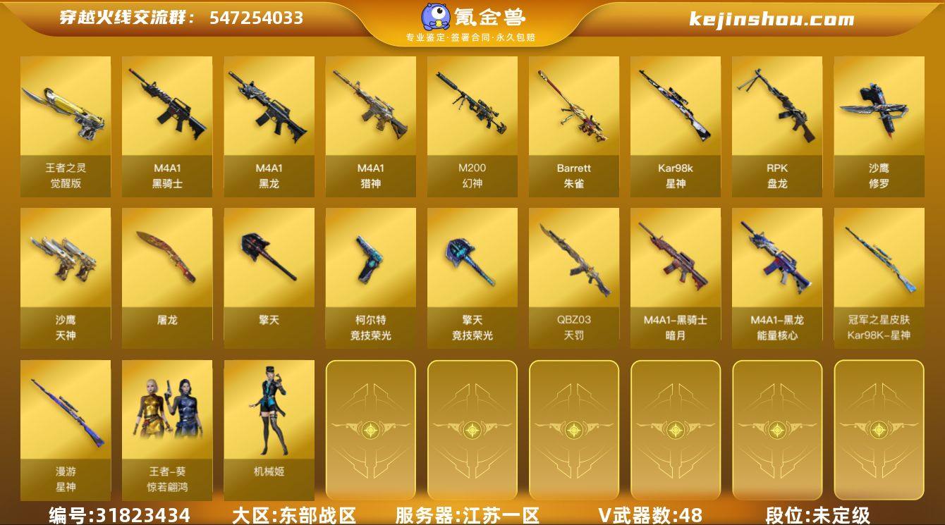 江苏一区-57V-6王者武器数-0炫金武器数 【热门武器】:M200-幻神,死亡之眼,Kar98K-星神,M4A1-黑骑士*2,RPK-盘龙,加特林-炼狱*3,沙鹰-修罗 【音效卡】:M4A1-黑骑士音效卡,QBZ03-天罚音效卡,Barrett-碧霄极光音效卡*3,麒麟刺-百战金芒-盛典舞曲音效卡,炼狱-百战金芒-庆典舞曲音效卡 【皮肤】:星神-漫游,Kar98K-星神-冠军之星皮肤,M4A1-再燃火线,黑龙-能量核心,黑骑士-暗月,极光-能量核心,轻型军用手斧-再燃火线 【角色】:机械姬,王者葵-惊若翩鸿,暗夜-X,娟娟,潘多拉-甜心教官,斯沃特-X 【人偶武器】:深渊终结者手雷 【暴走生化】:死亡之眼 【英雄级武器】:M4A1-黑龙,M4A1-黑骑士*2,QBZ03-天罚,FAMAS G2-天戎,M4A1-猎神,王者之势-觉醒版,王者猎神-觉醒版,M200-幻神,Barrett-朱雀,Kar98K-星神,RPK-盘龙,加特林-炼狱*3,炼狱-百战金芒,沙鹰-修罗,沙鹰-天神*3,柯尔特-竞技荣光*2,王者之灵-觉醒版,屠龙*3,擎天,擎天-竞技荣光,麒麟刺-百战金芒,高爆手雷-竞技荣光*2,闪光弹-竞技荣光*6,烟雾弹-竞技荣光*7,M4A1-苍鸣雷神 【道具】:BS战队炫彩背包,云山科技背包,奇洋探员-海龟背包,炫彩背包,百战金芒炫彩背包,女皇终结者-魔龙之吻,救世主-黑桃战神,绿色巨人,灵魂忍者,迷雾幽灵,夺命之镰*2,防化服*3,流光-鎏金之域,流光-再燃火线,枪王排位29赛季金色流光,语音特效-盛典烟火,萌萌小葵表情,炽雪表情,动感闪耀表情,C4-沙漠,防弹头盔*6,防弹衣*6,C4工具钳*6,手雷包*6 【特殊枪械】:2黑骑士,1盘龙,3炼狱