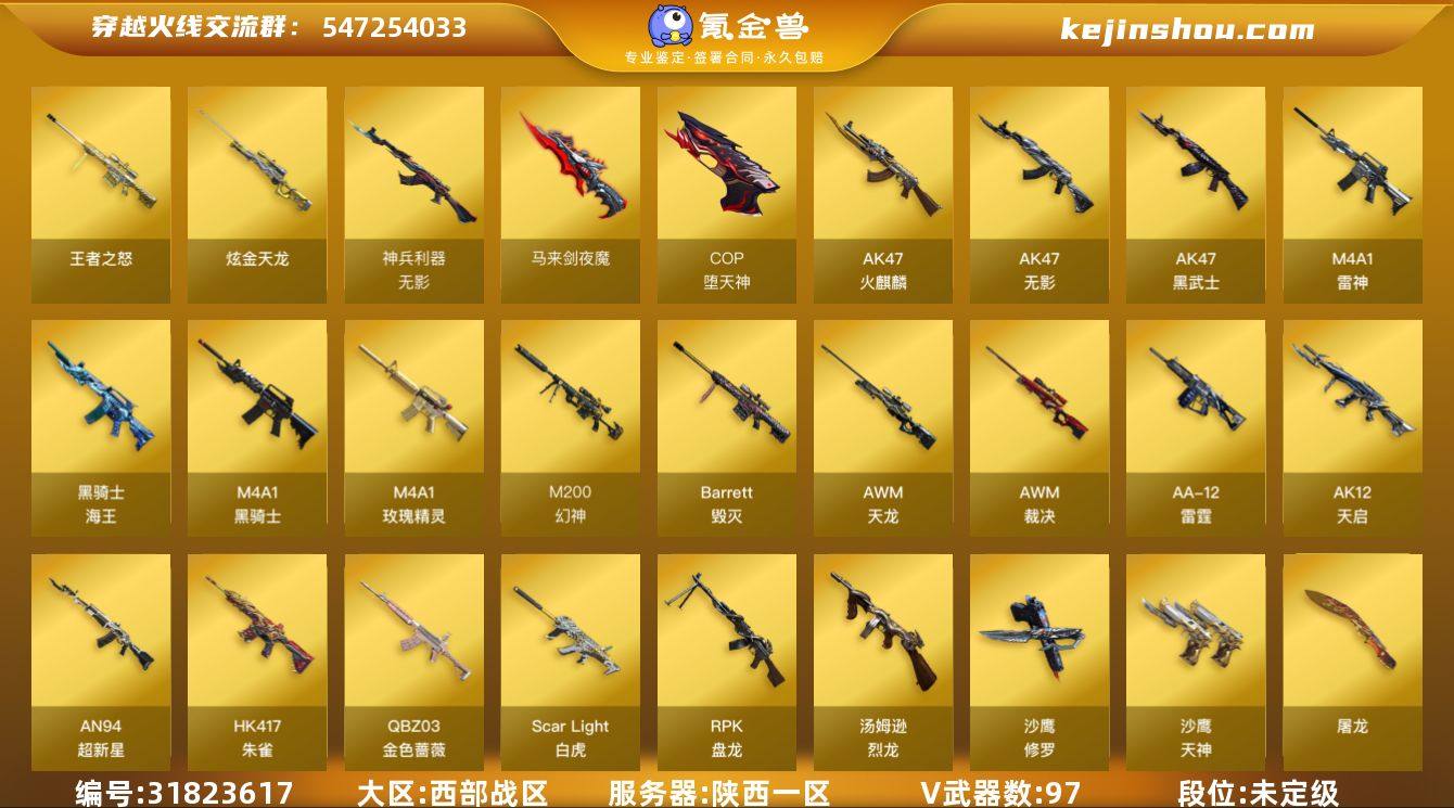 陕西一区-101V-3王者武器数-1炫金武器数 【热门武器】:QBZ03-金色蔷薇,Scar Light-白虎,HK417-朱雀,M200-幻神,M200-竞技荣光,死亡之眼,金色小号,C.A.T,M4A1-黑骑士*4,汤姆逊-烈龙*8,RPK-盘龙*6,加特林-炼狱,斯泰尔-蝴蝶,COP-堕天神,沙鹰-修罗*3 【王者炫金武器】:王者之怒,炫金天龙 【音效卡】:M4A1-黑骑士音效卡,Barrett-毁灭音效卡 【皮肤】:汤姆逊-烈龙-末日皮肤*4,毁灭-暗月,毁灭-CFS2020,毁灭-黑大圣皮肤,毁灭-英雄计划 皮肤,黑骑士-暗月*2,无影-暗月,死神-秘银,战神-粉色甜心皮肤*3,战神-紫绶金章皮肤*8,战神-流金岁月皮肤*3,AWM-天龙-传奇70KG 【角色】:樱,暗夜-X,嘉年华灵狐,娟娟,潜龙队-X,铁骑-乘风破浪,铁骑荣耀,新娜塔莎,影武者-X,职业选手 【人偶武器】:天龙-曼陀罗,火麒麟-灵狐,斯泰尔-蝴蝶,AWM-灵狐-15周年嘉年华,C.A.T,迷你深渊冰龙,迷你牛牛*4,迷你生化手雷,深渊终结者手雷*3,闪光弹-小乔 【暴走生化】:死亡之眼 【挑战大师】:神圣爆裂者III,激光毁灭者III,KAC-圣炎切割者III,神圣爆裂者-末日III*2,阐释者III*2 【英雄级武器】:AK47-火麒麟,M4A1-雷神,M4A1-黑骑士*4,AK47-无影,AK47-黑武士*2,AK12-天启,AN94-超新星,HK417-朱雀,Scar Light-白虎,无影-神兵利器,M4A1-玫瑰精灵,QBZ03-金色蔷薇,AK-47-猩红传说*11,AK47-B-战神,黑骑士-海王,AWM-天龙*2,Barrett-毁灭,AWM-裁决,M200-幻神,M200-竞技荣光,王者之怒-觉醒版,RPK-盘龙*6,加特林-炼狱,汤姆逊-烈龙*8,AA-12-雷霆,沙鹰-修罗*3,沙鹰-天神,COP-堕天神,屠龙*2,龙啸,马来剑-夜魔,擎天*4,麒麟刺,擎天-竞技荣光,斩神刀-雷暴,王者之锋-觉醒版,高爆手雷-雷暴*3,高爆手雷-夜魔,高爆手雷-竞技