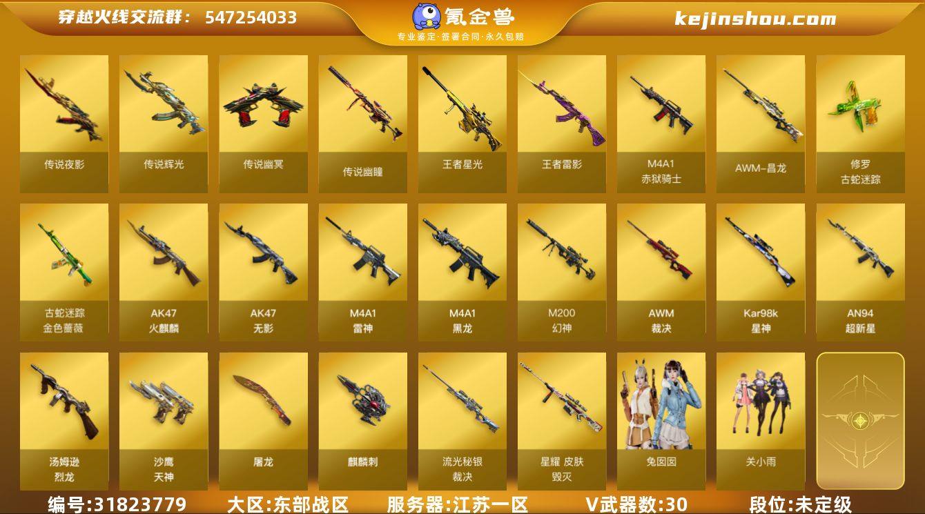 江苏一区-32V-4王者武器数-0炫金武器数 【传说武器】:传说辉光,传说夜影,传说幽瞳,传说幽冥 【热门武器】:传说夜影,传说辉光,传说幽瞳,传说幽冥,M200-幻神,金色蔷薇-古蛇迷踪,修罗-古蛇迷踪,Kar98K-星神,牛牛-AK47,汤姆逊-烈龙*5,羊驼玩偶 【王者炫金武器】:王者雷影,王者星光 【音效卡】:M200-幻神音效卡,M4A1-雷神音效卡,M4A1-黑骑士音效卡,M14EBR-玄武音效卡,Barrett-碧霄极光音效卡*2,AWM-昌龙-怀旧音效卡*2 【皮肤】:幻神-电流骇客 皮肤,裁决-流光秘银,毁灭-星耀 皮肤,炼狱-星空 【角色】:关小雨,零·纪元,战地猎狐,蛇隐宗,暗夜-X,风暴女,曼陀罗-X,蛇姬,兔囡囡,智影 【人偶武器】:Scar Light-马枪,COP-旗袍,牛牛-AK47,巴雷特-赏金猎人,Barrett-夜玫瑰 【英雄级武器】:AK47-火麒麟,M4A1-黑龙,M4A1-雷神,AK47-无影,AN94-超新星,金色蔷薇-古蛇迷踪,王者风势-觉醒版,AWM-裁决,M200-幻神,Kar98K-星神,王者风神-觉醒版,汤姆逊-烈龙*5,沙鹰-天神*2,修罗-古蛇迷踪,屠龙*2,麒麟刺*2,高爆手雷-古蛇迷踪,烟雾弹-古蛇迷踪,M4A1-赤狱骑士,AWM-昌龙,Barrett-碧霄极光*2 【道具】:BS战队炫彩背包,冰冰企鹅背包,古蛇迷踪炫彩背包,超级背包,女皇终结者-魔龙之吻,救世主-黑桃战神,绿色巨人,灵魂忍者,迷雾幽灵,夺命之镰,防化服*3,枪王排位29赛季金色流光,古蛇迷踪打击特效,蛇隐宗表情,C4-沙漠,C4-再燃火线,防弹头盔*2,防弹衣*2,C4工具钳*2,手雷包*2 【特殊枪械】:5烈龙