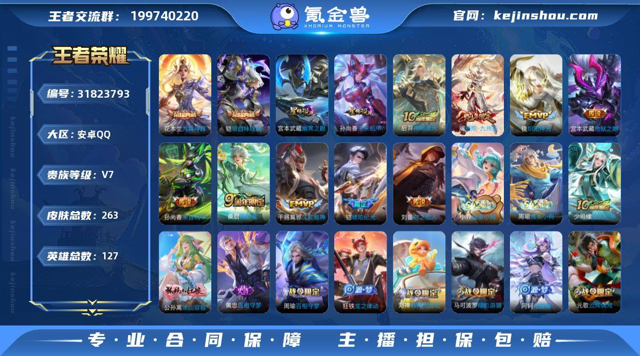 QQ区,可修改实名,连提号,安全放心。 贵族V7,英雄127个,皮肤总数263个。 荣耀水晶×2:银白咏叹调、九霄神辉 传说皮肤×9:久胜战神、时之恋人刘备、地狱之眼、末日机甲孙尚香、鸣野蒿、琥珀纪元铠、炽阳神光、神树通天、愿照·九州拓 史诗皮肤×75,稀有英雄齐全:韩信、嬴政、艾琳、娜可露露、不知火舞、夏洛特等。 账号无封禁,正常使用,资料齐全