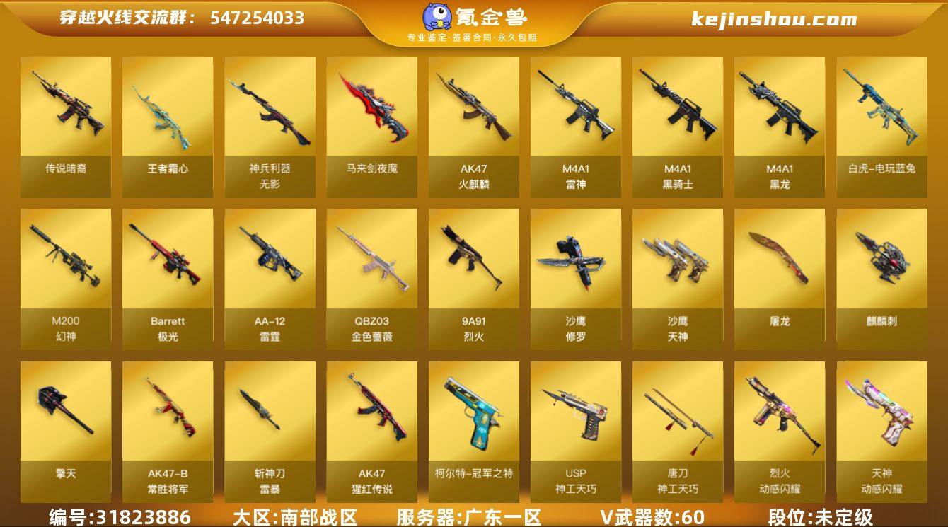 广东一区-68V-6王者武器数-0炫金武器数 【传说武器】:传说暗裔 【热门武器】:传说暗裔,QBZ03-金色蔷薇,M14EBR-玄武,M200-幻神,白虎-电玩蓝兔,柯尔特-冠军之特,M4A1-黑骑士*2,加特林-炼狱,COP-白鲨,沙鹰-修罗*4,Knife-冠军之刃,金刚伞 【王者炫金武器】:王者霜心 【音效卡】:M200-幻神音效卡,M4A1-黑骑士音效卡,QBZ03-金色蔷薇音效卡 【皮肤】:幻神-CFS2022,幻神-荣耀世冠白鲨2023 皮肤,QBZ03-冠军之薇,雷神-荣耀之魄,雷神-星空,雷神-宇航兔皮肤,火麒麟-轻羽皮肤,火麒麟-心动糖果,毁灭-荣耀之怒,毁灭-黑大圣皮肤,M4A1-千变-孔明皮肤,黑骑士耀金皮肤,AK47-B-常胜将军-曹操,AK47-B-常胜将军-孙权*2,麒麟刺-萌杀皮肤 【角色】:雨棠,鹰,王者-瞳-闭月羞花,王者玲珑,王者沙漠玫瑰,乔伊教练,暗夜-X,芳心审判者,虎妞,嘉年华灵狐,兰-海滩派对,灵狐者-X,灵狐者-七夕宝贝,龙儿,龙儿-小淘气,玫瑰花神,萌儿,潘多拉-X,青霞仙子,斯沃特-X,兔囡囡,雪莉杨-摸金校尉,职业选手 【人偶武器】:COP-白鲨,AWM-灵狐-15周年嘉年华,迷你深渊冰龙,迷你裂空之翼*2,迷你波特博士*2,夺魂,迷你牛牛,生化手雷-机甲核心,深渊终结者手雷,闪光弹-貂蝉,高爆手雷-大乔,迷你艾比,迷你超能女侍 【暴走生化】:超级对讲机 【挑战大师】:冰龙粉碎者-白马银枪,试炼破坏者III,神圣爆裂者-末日III 【英雄级武器】:AK47-火麒麟*2,M4A1-黑龙,M4A1-雷神,M4A1-黑骑士*2,M14EBR-玄武,无影-神兵利器,QBZ03-金色蔷薇,9A91-烈火,烈火-动感闪耀,AK-47-猩红传说,AK47-B-常胜将军,王者白虎-觉醒版,QBZ-03-王者蔷薇-觉醒版,白虎-电玩蓝兔,白虎之魄-觉醒版,Barrett-极光,M200-幻神,王者之决-觉醒版,王者星神-觉醒版,加特林-炼狱,AA-12-雷霆,沙鹰-修罗*4,沙鹰-天神,柯尔特-冠...