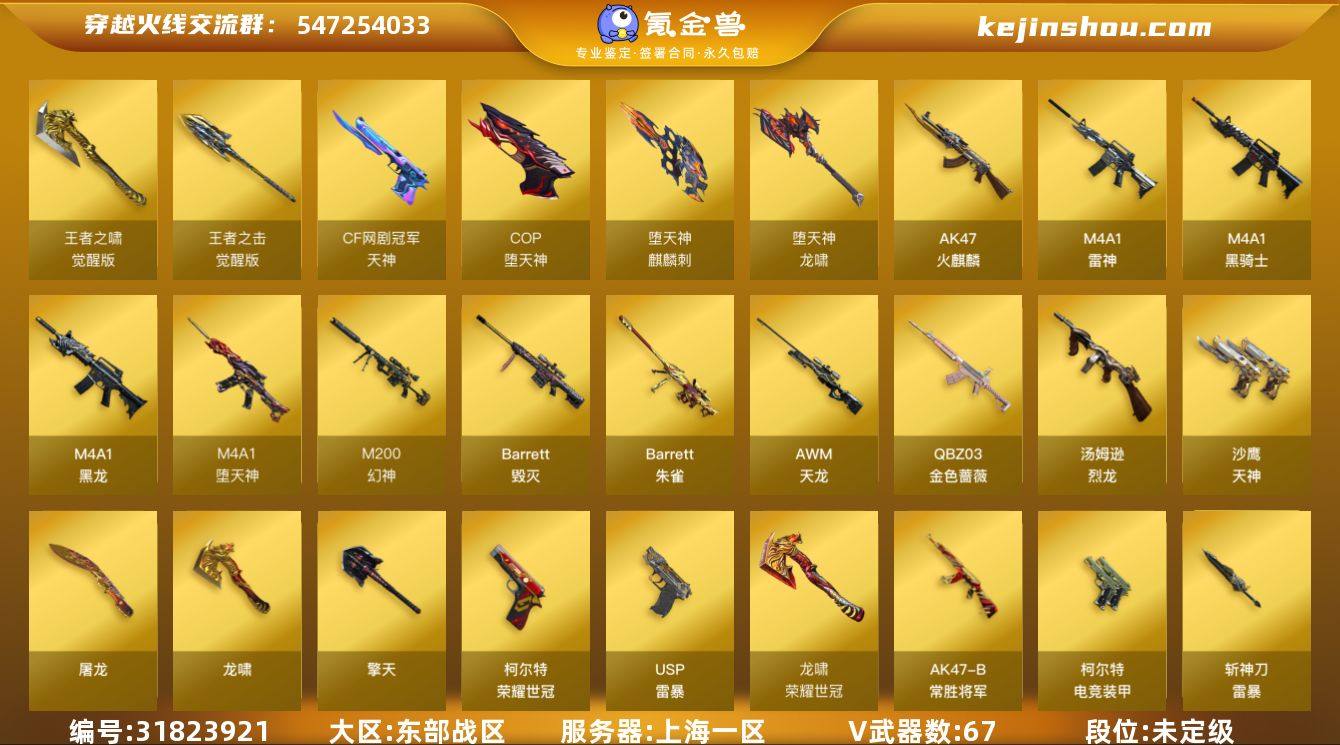 上海一区-84V-15王者武器数-0炫金武器数 【热门武器】:QBZ03-金色蔷薇,M200-幻神,死亡之眼,荣耀世冠-柯尔特,M4A1-黑骑士,汤姆逊-烈龙*6,加特林-炼狱,斯泰尔-蝴蝶,USP-雷暴,COP-堕天神*4,荣耀世冠-龙啸 【音效卡】:AK47-火麒麟音效卡,M4A1-黑骑士音效卡 【皮肤】:M200-幻神-黄忠皮肤,幻神-冠军之幻,雷神-虎将,雷神-耀金皮肤,雷神-冠军之魄,火麒麟-华夏之心,火麒麟-轻羽皮肤,火麒麟-平天大圣,毁灭-黑大圣皮肤*2,毁灭-英雄计划 皮肤,M4A1-千变-孔明皮肤,M4A1-黑龙-361,黑骑士-暗月,黑骑士-冠军之势,AK47-B-常胜将军-刘备,AK47-B-常胜将军-孙权,AWM-天龙-传奇70KG 【角色】:魅影,炫,王者-葵-貂蝉,王者玲珑,王者玲珑-小乔,空,暗夜-X,娟娟,灵狐者-黄金海岸,铁骑荣耀,兔囡囡,樱-战斗天使,影武者-X,幽 【人偶武器】:斯泰尔-蝴蝶,巴雷特-零-水下丽影,迷你生化手雷 【暴走生化】:双面神,死亡之眼,超级对讲机 【英雄级武器】:AK47-火麒麟,M4A1-黑龙*2,M4A1-雷神,M4A1-黑骑士,M4A1-堕天神,QBZ03-金色蔷薇,AK47-B-常胜将军,M4A1-雷霆王者-觉醒版,黑武士-CF网剧冠军,AWM-天龙,Barrett-毁灭,M200-幻神,Barrett-朱雀,王者幻神-觉醒版,Barrett-雷霆王者-觉醒版,加特林-炼狱,汤姆逊-烈龙*6,沙鹰-天神,USP-雷暴,COP-堕天神*4,COP 357-雷霆王者-觉醒版*2,柯尔特-电竞装甲,荣耀世冠-柯尔特,天神-CF网剧冠军,屠龙,龙啸*4,麒麟刺-堕天神*2,擎天,幻灵之锋,荣耀世冠-龙啸,龙啸-堕天神,斩神刀-雷暴,王者之锋-觉醒版,王者之啸-觉醒版,王者之击-觉醒版,雷霆王者之锋-觉醒版*2,高爆手雷-雷暴*4,高爆手雷-堕天神*7,高爆手雷-雷霆王者-觉醒版,闪光弹-雷暴*4,闪光弹-堕天神*3,闪光弹-雷霆王者-觉醒版*2,烟雾弹-雷暴*4,烟雾弹-堕天神*3,烟雾弹