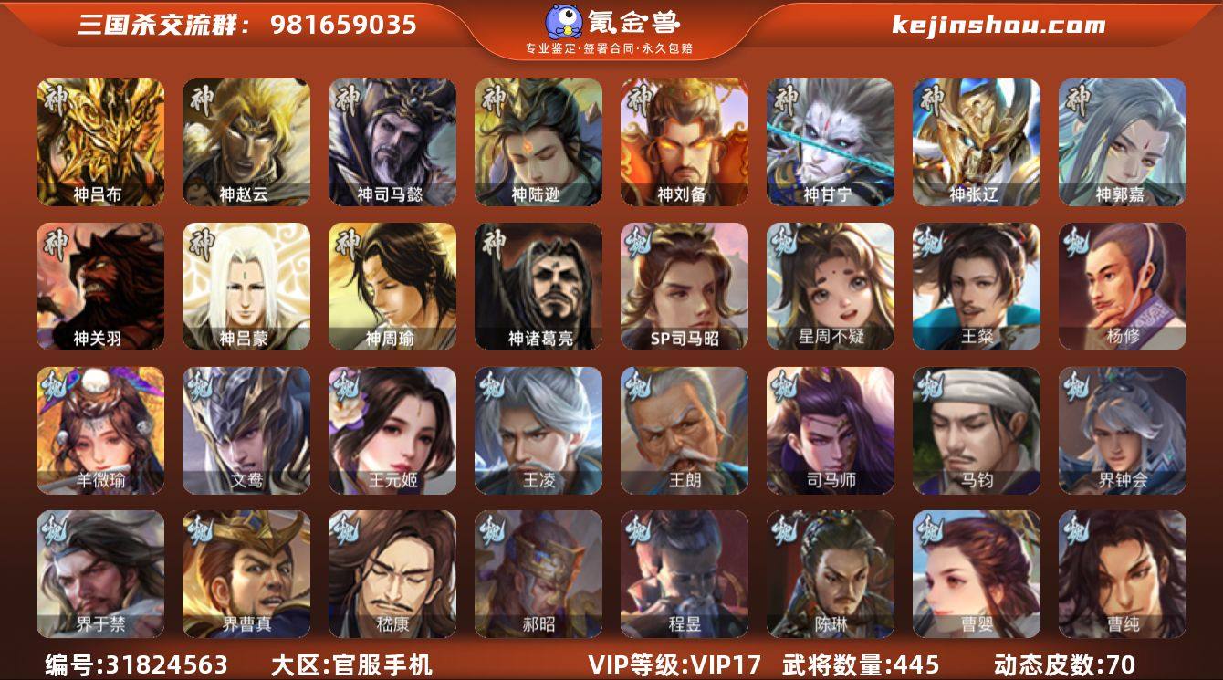 官阶:大将军;VIP等级:VIP17;史诗武将数量:81;动态皮肤数量:70;武将总数:445;史诗宝珠数量:0;将魂数量:10059;神将:9;魏国史诗武将:41;蜀国史诗武将:14;吴国史诗武将:11;群史诗武将:27