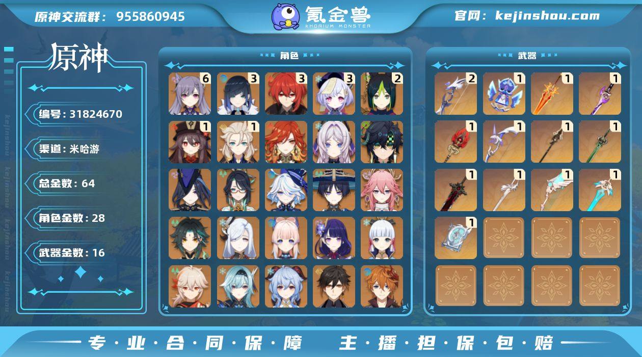邮箱: 不送邮/死邮 总黄数: 64 冒险等级: 60 6命金色角色: 满命刻晴 3命金色角色: 三命迪卢克,三命七七,三命夜兰 2命金色角色: 二命提纳里 1命金色角色: 一命阿贝多,一命胡桃 0命金色角色: 温迪,枫原万叶,优菈,神里绫华,可莉,达达利亚,钟离,莫娜,甘雨,魈,雷电将军,珊瑚宫心海,申鹤,八重神子,流浪者,芙宁娜,闲云,克洛琳德,基尼奇,玛薇卡,茜特菈莉 拥有武器: 狼的末路,天空之翼,雾切之回光,四风原典,阿莫斯之弓,风鹰剑,天空之刃,贯虹之槊,磐岩结绿,护摩之杖,若水,焚曜千阳,祭星者之望 2精武器: 若水 1精武器: 狼的末路,天空之翼,雾切之回光,四风原典,阿莫斯之弓,风鹰剑,天空之刃,贯虹之槊,磐岩结绿,护摩之杖,焚曜千阳,祭星者之望