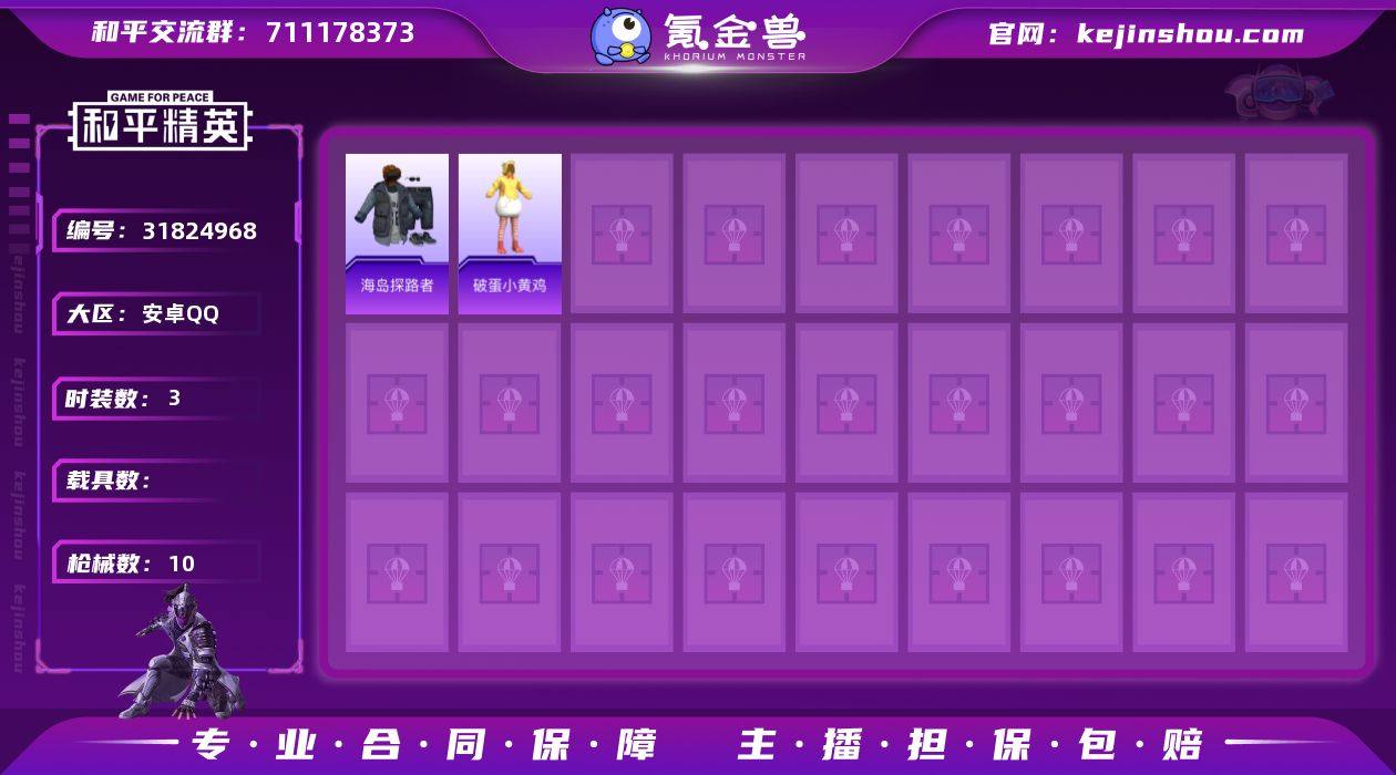 安卓 手Q-0粉装-0特效枪-0载具-0粉色飞行器-2110热力值-0王牌印记-3套装-10枪皮 【稀有枪皮】:AUG-天降萌叽,QBZ-彩虹符号,蜜獾-天降萌叽,UZI-天降萌叽 【其他套装】:套装-海岛探路者,套装-破蛋小黄鸡 【营地ID】:952912005