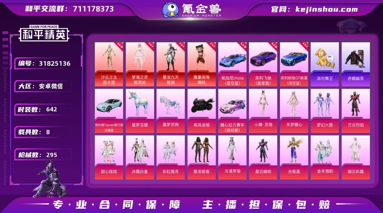 实名:不可二次实名 是否支持人脸包赔:不支持 粉装数量:24 特效枪数量:26 载具数:8 时装数:642 枪械数:295 赤蝎幽灵,派对舞王 五级沙丘之主-图卡盟,一级梦海之灵-妮芮妲,一级墨龙九天-敖渊,一级魔童闹海-哪吒 五级帕加尼imola(星空蓝),五级宾利飞驰(皇家紫),一级宾利欧陆GT敞篷(深空蓝) 小舞·灵珑,羊梦糖心,冰霜白皇,初号机 觉醒Ver.,初号机款机体服,彩虹鹿灵,第五大道,繁龙极客,光极星,金丰海韵,恐龙拽拽,冷漠罗丽,美琪,美雪,梦幻火箭,千金淑猫,守护天翼,时空协奏·心弦,甜心娃娃,万古烈焰,星云暗核,樱桃泡泡,烟云彩露,宙之时溯 八级M416-墨龙九天,七级AKS-74U-星穹咏叹调,六级MG-36-幻梦之森,六级P90-金丰海韵,六级SCAR-L金蛇镇世,六级UMP45-宇宙意志,五级ACE32-萌骑漫游,五级DP-28-豹影疾电,五级AKM-炫紫旋律,五级AUG-暖羊咩咩,五级AUG-星梦奇缘,五级Kar98K-巳巳如意,五级M762-甜心娃娃,五级MK14-樱桃泡泡,五级PKM-守护天翼,五级UMP45-量子极限,四级平底锅-喜羊羊与灰太狼,四级DP-28-千金淑猫,三级AKS-74U-森灵之息,二级GROZA-精灵之光,一级M200-梦海之灵,一级M416-五爪金龙,一级M417-第五大道,一级P90-沙丘之主,一级SCAR-L-童趣迷兔,一级UMP45-相思残雪 保时捷Taycan旅行版(冰晶蓝),疾风龙骑,晶梦灵驹,糖心拉力赛车(波动紫),星梦玉骢 狙击之神,马上有钱,福马献瑞,松绒汪汪,红釉青花,SS37特训,雨过天青,玲珑侠影,理性主义,青翼流星,阳光菠萝,雪国风尚,画境星梦,琴音绮想,书海巡游,SS36特训,炫彩糖果,粉黛兰香,萌鸡速递,风迹短诗,秘语星愿,SS35特训,午间小调,元气之梦,懒羊羊,美羊羊,薄荷星砂,狂鲨锋刃,凌霄紫焰,SS34特训套装,朱霞炽焰,8号机,冰川谧蓝,冰冻风暴,缤纷果语,缤纷焰火,白光莹,冰河战士,纯白跃动,春光漫游,雏菊兔兔,长空猛禽,赤蝎幽灵,纯真浪花,顶瓜瓜,蝶变,大橘大利,都市丽猫,淡雅花蕊,飞驰魅影,绯格组合,粉恋花,粉日山川,诡诞巡游,龟仙人,光之冒险,海岛探路者,虎虎生威吉莉,湖畔霞光,幻世战舞者,红熊茄茄,幻羽潜行,惊鸿侠骨,娇憨猪猪,竞技名士,吉莉礼服,晶灵使者,极速竞梦,街头潮人,街头风暴,锦衣飞扬,空岛之星,快乐星愿,快闪甜心,空投萌叽,蓝冰羽,龙的传人,拉斐尔,绿翡凌光,龙魂突击队,萝兰蝴蝶,莱茵河畔,恋语绒绒,Mark.06,漫步者,摩登魅猫,棉花软糖,魔力冰咖,茉莉之诺,萌趣咩咩,明日香款战斗服,蜜桃派对,明鸳圣池,卖崽青蛙,暖风夏荷,霓虹极客,霓虹街区,柠萌假日,牛气满满,派对舞王,破蛋小黄鸡,沁蓝冰爽,绮丽涂鸦,青团波波,俏兔智灵,骑行爱好者,云朵鹅,绒宝小鹅,瑞龙福将,热情海星,沙漠兵团,SS17特训,SS18特训,SS19特训,SS20特训,SS21特训,SS25特训,SS26特训,SS27特训,SS28特训,SS29特训,SS30特训套装,SS31特训套装,SS32特训套装,SS33特训套装,巳巳如意,石蕴玉辉,童话森林,糖霜甜心,糖糖葫芦,童心宝龙,铁血战翼,团圆交子,特战装甲,完美偶像,王牌教练,炫蓝之夏,小鸟芋圆,雪绒豹,夏日音浪,雪山精英,醒狮腾龙,香桃花海,星途旅人,香榭午后,星渊小夜曲,星影赞美诗,异彩先驱,月蓝流光,音速流光,焰山流火,玉兔迎春,鹰眼刺客,焰鹰斗篷,鱼渊荷华,燕燕于飞,异域银装,真理款战斗服,智谋