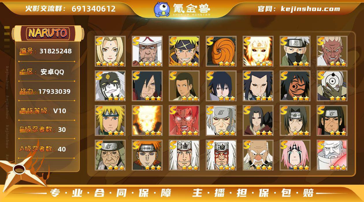 实名:可二次实名 贵族等级:V10 战力值:17933039 S忍数:30 A忍数:40 五星纲手,四星猿飞日斩,三星漩涡鸣人·宇智波佐助,三星宇智波斑「五影会谈」,三星波风水门「九喇嘛连结」,三星旗木卡卡西「须佐能乎」,三星艾「忍界大战」,三星大筒木桃式,三星宇智波斑「秽土转生·解」,三星千手柱间·木叶创立,三星宇智波佐助「永恒万花筒」,三星三代目风影「秽土转生」,三星神秘面具男「红夜之刃」,三星宇智波斑「白面具」,三星波风水门,三星漩涡鸣人「九喇嘛连结」,三星迈特凯「死门」,三星千手扉间「秽土转生」,三星宇智波鼬「秽土转生」,三星宇智波鼬「须佐能乎」,三星千手柱间「秽土转生」,三星猿飞日斩「秽土转生」,三星佩恩「天道」,三星自来也,三星自来也「仙人模式」,三星大野木「忍界大战」,三星春野樱「忍界大战」,三星大筒木金式「博人传」,三星自来也「舞之豪杰」,三星大蛇丸 五星蝎,五星干柿鬼鲛,五星猿飞阿斯玛,五星迈特凯,三星土台「忍界大战」,三星飞段「死司凭血」,三星飞段,三星我爱罗「疾风传」,二星小南「神驹佑将」,二星迈特凯「青春爆炸」,二星巳月「仙人模式」,二星大野木「侠隐江湖」,二星机械鸣人「初始形态」,二星桃地再不斩「秽土转生」,二星神农「羁绊」,二星宇智波泉奈,二星蝎「绯流琥」,二星李洛克「忍界大战」,二星宇智波鼬「夏日限定」,二星漩涡博人「桃式显现」,二星日向宁次·忍界大战,二星不缘,二星长十郎「六代目水影」,二星长门「青年」,二星艾「青年」,二星达鲁伊「五代目雷影」,二星波风水门「青年」,二星宇智波佐助「须佐能乎」,二星迪达拉「秽土转生」,二星千代「近松十人卫」,二星药师兜「半蛇斗篷」,二星秋道丁次「忍界大战」,二星大蛇丸「晓」,二星春野樱「百豪」,二星照美冥「五代目水影」,二星宇智波佐助「万花筒写轮眼」,二星志村团藏,二星迪达拉,二星宇智波鼬,二星桃地再不斩 卖家说:30s40a一组极品号,经常冠军,卖出去之前日常会一直做