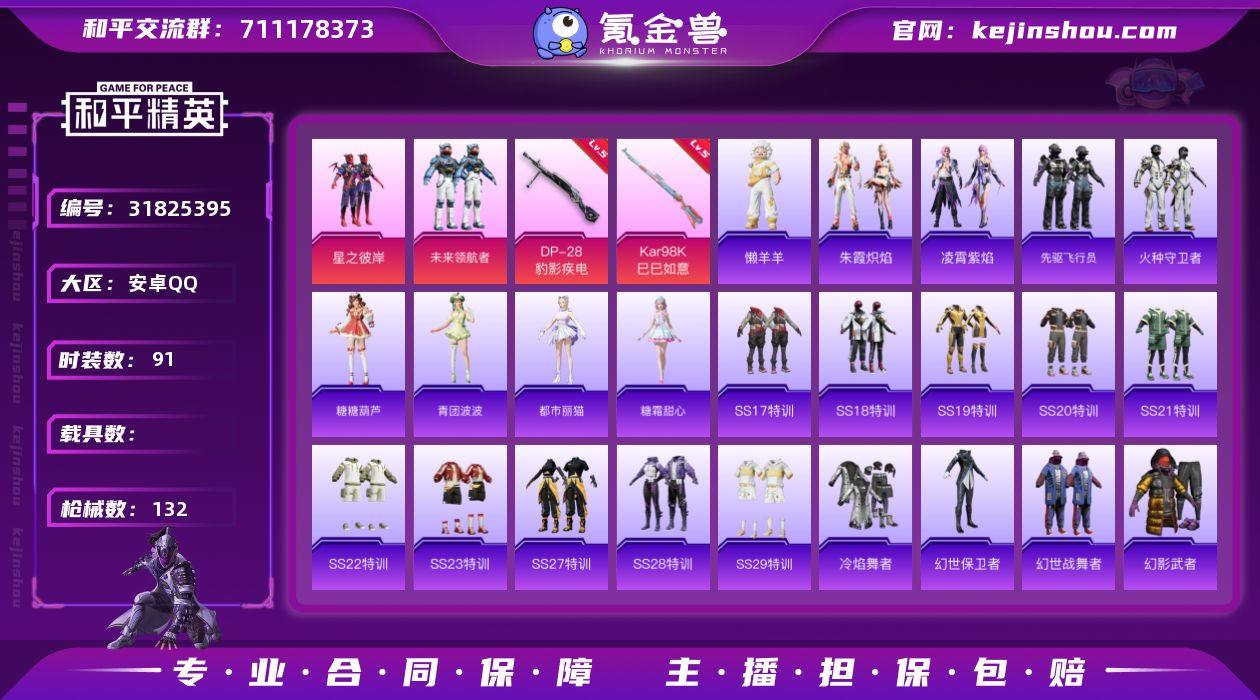 安卓 手Q-2粉装-5特效枪-0载具-1粉色飞行器-35688热力值-5王牌印记-91套装-132枪皮 【粉色套装】:粉装-星之彼岸,粉装-未来领航者 【粉色枪皮等级】:ACE32-萌骑漫游(三级),AKS-74U-森灵之息(四级),Kar98K-巳巳如意(五级),Mk14-福马献瑞(五级),DP-28-豹影疾电(五级) 【粉色枪皮】:ACE32-萌骑漫游,AKS-74U-森灵之息,Kar98K-巳巳如意,Mk14-福马献瑞,DP-28-豹影疾电 【粉色飞行器】:炫彩糖果飞行器 【粉色降落伞】:未来领航者降落伞,异瞳寒姬降落伞,极意拳锋降落伞,炫彩糖果降落伞 【稀有套装】:套装-炫彩糖果,角色-阿虎,套装-马上有钱,套装-先驱飞行员,套装-火种守卫者,套装-糖糖葫芦,套装-青团波波,角色-都市丽猫,角色-糖霜甜心,套装-朱霞炽焰,套装-凌霄紫焰,玩偶服-懒羊羊,角色-霜刃之御,套装-雨过天青,套装-红釉青花 【稀有枪皮】:AUG-冰晶雪宝,AKM-影袭,AKM-生命誓言,AKM-破晓战魂,AKM-霓虹街区,AKM-龙的传人,M16A4-幻世战舞者,M16A4-红色方程式,SCAR-L-玉兔迎春,SCAR-L-红色方程式,M416-夜灯,M416-红色方程式,M416-蓝色火焰,GROZA-彩虹符号,GROZA-影袭,GROZA-田园牧歌,AUG-耀粉歌者,M762-天降萌叽,Mk47-洛神天依,蜜獾-千面幻镜,蜜獾-天降萌叽,ARX-凌霄紫焰,UZI-影袭,UZI-炫彩节奏,UZI-红色方程式,UMP45-生命誓言,UMP45-蓝色火焰,Vector-田园牧歌,汤姆逊-天降萌叽,汤姆逊-暗夜鎏金,汤姆逊-樱桃泡泡,AKS-74U-鬼刀,JS9-凌霄紫焰,P90-巳巳如意,Kar98K-彩虹符号,Kar98K-红色方程式,M24-影袭,M24-炫彩节奏,SKS-炫彩节奏,VSS-田园牧歌,S686-生命誓言,S686-红色方程式,S1897-炫彩节奏,S12K-破晓战魂,S12K-幻世战舞者,DBS-圣堂之誓,DBS-彩虹符号,SPAS-12-田园牧歌,M249-破晓战魂,DP-28-旋转彩虹,MG3-幻世战舞者,MG-36-凌霄紫焰,P92...