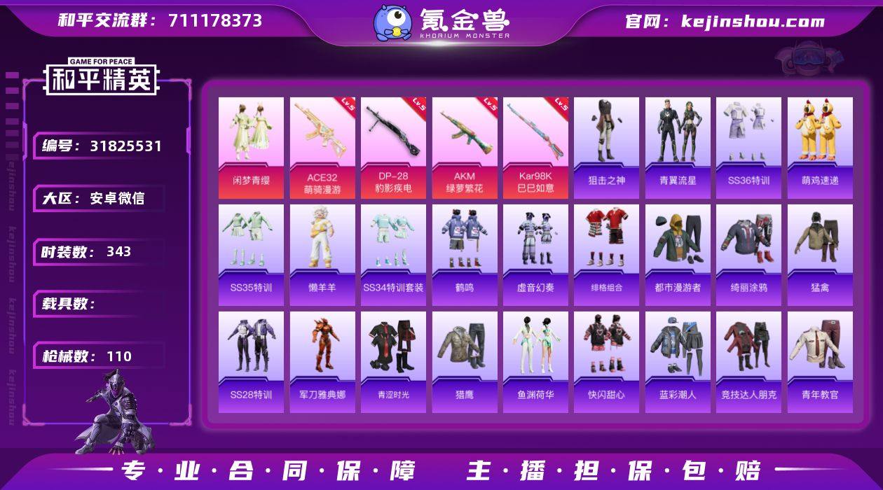 实名:可二次实名 是否支持人脸包赔:不支持 粉装数量:1 特效枪数量:4 时装数:343 枪械数:110 闲梦青缨 五级ACE32-萌骑漫游,五级DP-28-豹影疾电,五级AKM-绿萝繁花,五级Kar98K-巳巳如意 狙击之神,青翼流星,SS36特训,萌鸡速递,SS35特训,懒羊羊,SS34特训套装,冰川特警,春光漫游,长空猛禽,大橘大利,都市魅力,都市漫游者,绯格组合,粉红小猪,福星高照,海岛探路者,鹤鸣,湖蓝色名流,黄色伏地魔,幻世战舞者,极地朋克,军刀雅典娜,惊鸿侠骨,娇憨猪猪,竞技达人朋克,竞技名士,街头风暴,锦衣飞扬,空岛之星,快闪甜心,蓝彩潮人,龙的传人,猎鹰,猎梦纪元,蓝色运动,恋语绒绒,冷焰舞者,猛禽,魅力单车,麻辣教官,萌趣咩咩,霓虹街区,牛气冲天,牛气满满,暖心橘喵,轻风白浪,绮丽涂鸦,青年教官,青涩时光,日照花林,SS20特训,SS21特训,SS22特训,SS23特训,SS25特训,SS26特训,SS27特训,SS28特训,SS29特训,SS30特训套装,SS31特训套装,SS32特训套装,SS33特训套装,巳巳如意,天籁歌者,特训学院,甜心亚梦,田园牧歌,完美偶像,无暇誓言,许七安,香桃花海,星途旅人,虚音幻奏,玉兔迎春,云霞荷露,鱼渊荷华,燕燕于飞,异域银装,战地督导,智谋强哥 炫彩糖果飞行器,炫彩糖果降落伞,彩虹甜喵降落伞,垂柳戏鸭降落伞,临安公主降落伞,旋转彩虹降落伞 卖家说:微信不能发信息