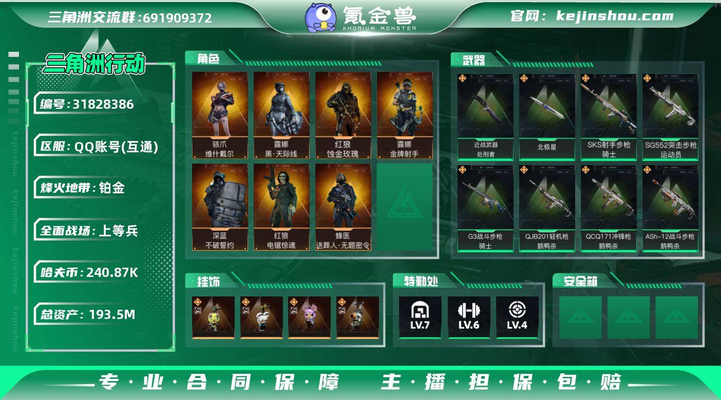 实名:可二次实名 总资产:193.5M 哈夫币:240.87K 烽火地带段位:铂金 烽火地带等级:60 全面战场段位:上等兵 全面战场等级:24 7级仓库,6级训练中心,4级靶场,3级指挥中心,1级潜水中心,3级防具台,3级工作台,1级制药台,2级技术中心,1级收藏室 战术部门等级:2 战斗部门等级:1 医疗部门等级:2 研发部门等级:1 后勤部门等级:1 曼德尔砖-气象感应:0 曼德尔砖-命运王牌:0 曼德尔砖-电玩高手:3 曼德尔砖-美杜莎:0