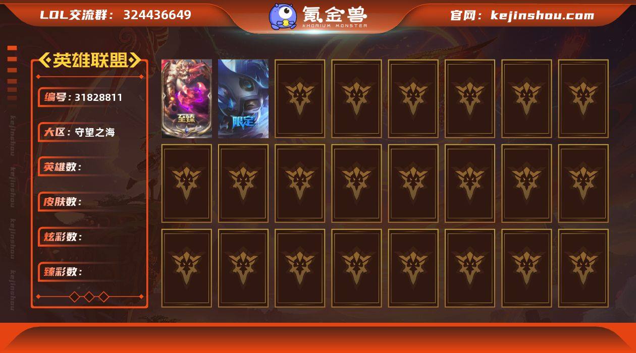 【LSA1329】156英雄/335皮肤/2终极/6神话/50限定/3臻彩/94炫彩/21传说/97史诗/黄金/至臻 烈焰美人 薇恩/至臻 K/DA 卡莎/吕布 奉先 炫金战神/霸天巨兽·雪崩 墨菲特/源计划: 火 菲奥娜 惩戒/龙年 孙悟空/南天之怒 沃里克/春晖神女 拉克丝/海克斯 阿利斯塔/海克斯 嘉文四世/甜心宝贝 安妮/觅心游侠卢锡安/幸福女神 乐芙兰/圣诞狂欢 努努/圣诞狂欢 时光/“主人不要我了” 阿木木/胡桃夹子 小丑/平安夜女神 娑娜/英勇玩具兵船长/邪恶圣诞老人 维迦/冰雪节 茂凯/冬季仙境 发条/雪默丁格/魄罗骑士 瑟庄妮/冰雪节 炼金/冰雪兽 纳尔/灵魂守卫/未来战士/10周年 安妮/源代码 乐芙兰/送披萨的小姐姐 希维尔/冠军之刃 锐雯 2016/S2 暗杀星 蒙多/S2 暗杀星 伊泽瑞尔/S4 SSW 炼金/S4 SSW 图奇/S4 SSW 雷恩加尔/S6 SKT T1 扎克/胜利枪神 格雷福斯/胜利女神 奥莉安娜/胜利之剑 亚托克斯/胜利机器人 布里茨/胜利之王 泰达米尔/胜利女神-菲奥娜/海贼 瑞兹/南瓜头 费德提克/无头骑士 赫卡里姆/蓝色忧郁 崔斯特/暗影 沃里克/野兽猎人 德莱文/野兽猎人 泰达米尔/勇者阿狸/电玩战魂 赫卡里姆/都铎王朝 图奇/防暴士兵 格雷福斯/防暴士兵 辛吉德/防暴天使 凯尔/惊悚派对 阿木木/警用试作体K-9 内瑟斯/鸡里奥/克格汪/地狱之门卫士 加里奥/战地机甲 厄加特/战场女武神 凯尔/钢铁之翼 凯尔/恶魔男爵 瑞兹/提莫:"约德尔人的一大步"/约德尔国队长 提莫/烈焰雄心 崔丝塔娜/合金巨兽 努努和威朗普/女皇 艾希/双重冰晶 艾尼维亚/黯晶凤凰 艾尼维亚/律政大亨 蒙多/死亡骑士 盖伦/枯萎之壤 泽拉斯/黯黑魔龙 希瓦娜/偶像歌手 阿狸/符文战熊 沃利贝尔/宇航员 诺提勒斯/霸天异形 卡兹克/灌篮高手 德莱厄斯/冰霜烈焰 安妮/皇家火炮手 崔斯特/特战先锋 赵信/绞肉机角斗士 赵信/铁钩船长 费德提克/天人合一 易/侍魂 易/地狱火 阿利斯塔/战争机器 赛恩/月光女神...