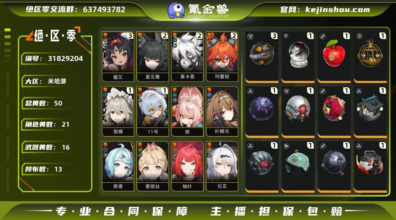 冒险等级:60 总黄数:50 五星角色数:21 菲林底片数量:0 菲林数量:3650 加密母带数量:6 3命猫又,2命星见雅,2命莱卡恩,2命珂蕾妲,1命丽娜,1命「11号」,0命叶瞬光,0命照,0命席德,0命爱丽丝,0命柚叶,0命仪玄,0命薇薇安,0命零号·安比,0命耀嘉音,0命浅羽悠真,0命简,0命青衣,0命艾莲,0命格莉丝 6命真斗,6命潘引壶,6命波可娜,6命赛斯,6命露西,6命苍角,6命派派,6命比利,6命本,6命安比,6命妮可,6命安东,6命可琳 3精硫磺石,1精云霓孤光,1精狸法七变化,1精青溟笼舍,1精飞鸟星梦,1精牺牲洁纯,1精玲珑妆匣,1精霰落星殿,1精淬锋钳刺,1精玉壶青冰,1精啜泣摇篮,1精嵌合编译器,1精拘缚者,1精燃狱齿轮,1精钢铁肉垫,1精深海访客 5精咔嚓仔,3精艾丝弥小姐,3精狮耶,1精阿饭,1精芽芽,1精比克布利克,1精罗宾,1精格列佛探员,1精赤红莫库斯,1精鲨牙布,1精巴特勒,1精艾米莉安,1精插头布 白心旧影,从周一到周五,狡黠甜心,墨形影踪,晴空化狸,晴澜双迹套装,水晶灯下,漪光夜曲 卖家说:没绑定邮箱,卡池垫了60抽大保底,主c毕业