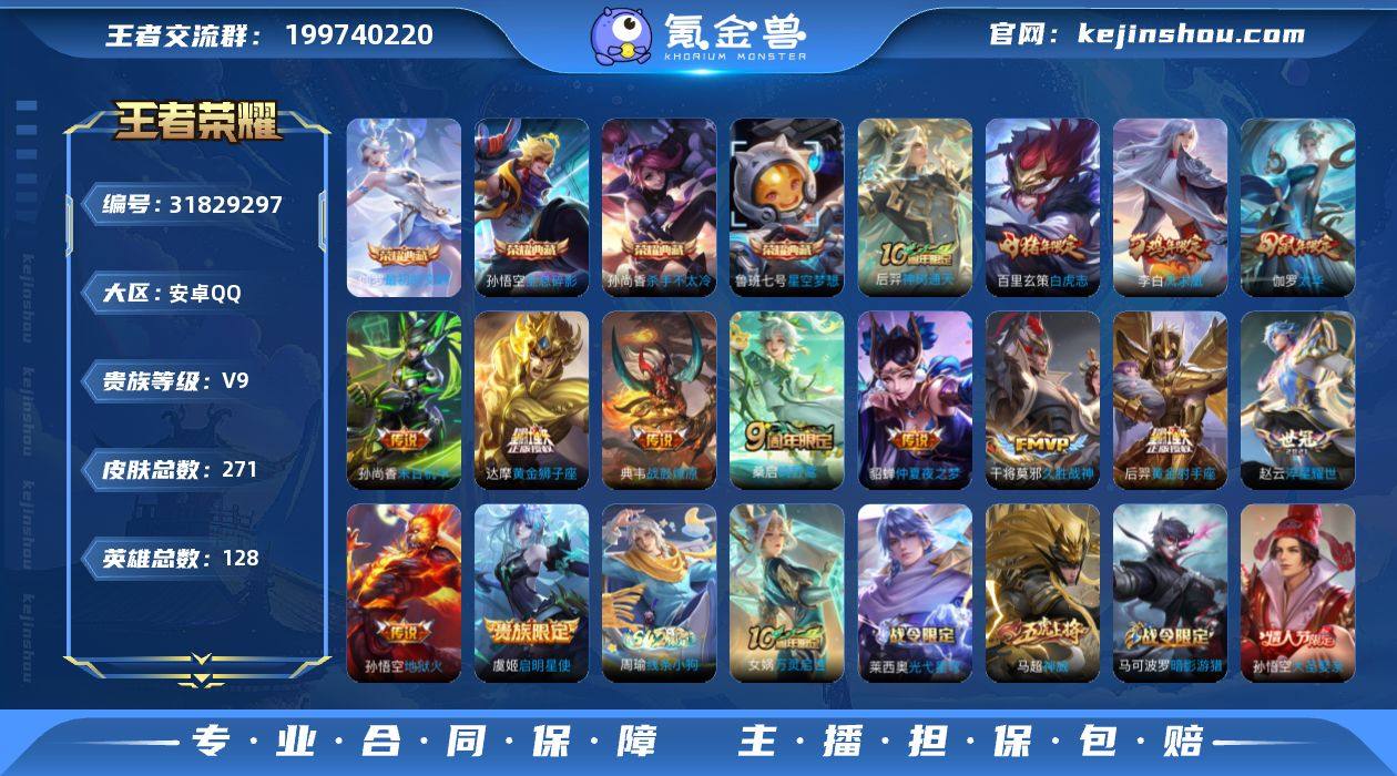 实名: 可修改 性别: 男号 贵族等级: V9 英雄数: 128 皮肤数: 271 荣耀水晶: 星空梦想,杀手不太冷,全息碎影,最初的交响 传说皮: 黄金狮子座,黄金射手座,久胜战神,末日机甲-孙尚香,地狱火,仲夏夜之梦,淬星耀世,典韦战鼓燎原,神树通天 限定皮: 冰锋战神,遇见飞天,李小龙,辉光之辰,天狼溯光者,神威,时之彼端,太华,天狼绘梦者,凤求凰,美猴王,白虎志,朱雀志,如梦令-后羿,大圣娶亲,高山流水,猪悟能,鸣野蒿 亮点: 【优质装备】:星空梦想(太空人),杀手不太冷,全息碎影(猴子典藏),最初的交响(伽罗典藏),黄金狮子座,黄金射手座,久胜战神,末日机甲-孙尚香(绿蚂蚱),地狱火,仲夏夜之梦(大飞蛾),淬星耀世