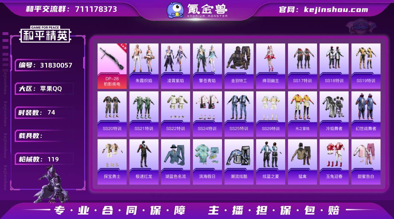 不可二次 苹果 手Q-无敌战神框-0粉装-3特效枪-0载具-1粉色飞行器-32223热力值-11王牌印记-74套装-119枪皮 QW2622511 【热门品类】:套装-金羽特工 【粉色枪皮等级】:UMP45-萌骑冒险(一级),Mk14-福马献瑞(四级),DP-28-豹影疾电(五级) 【粉色枪皮】:UMP45-萌骑冒险,Mk14-福马献瑞,DP-28-豹影疾电 【粉色飞行器】:炫彩糖果飞行器 【粉色降落伞】:环太平洋降落伞,旋转彩虹降落伞,星穹咏叹调降落伞,炫彩糖果降落伞 【稀有套装】:套装-马上有钱,角色-绛羽幽主,套装-朱霞炽焰,套装-凌霄紫焰,套装-擎苍青焰 【稀有枪皮】:AKM-星之彼岸,AKM-破晓战魂,AKM-虎虎生威,AKM-霓虹街区,AKM-龙的传人,M16A4-幻世战舞者,M16A4-甜心亚梦,M16A4-红色方程式,M16A4-蓝色火焰,SCAR-L-炫彩节奏,SCAR-L-玉兔迎春,SCAR-L-红色方程式,M416-红色方程式,M416-蓝色火焰,GROZA-异彩先驱,GROZA-田园牧歌,AUG-耀粉歌者,QBZ-彩虹符号,QBZ-飞驰魅影,M762-天降萌叽,M762-彩虹符号,M762-瑞龙福将,AC-VAL-天降萌叽,AC-VAL-甜心亚梦,蜜獾-天降萌叽,蜜獾-娇憨猪猪,ARX-凌霄紫焰,UZI-天降萌叽,UZI-娇憨猪猪,UZI-红色方程式,UMP45-涂山之恋,UMP45-生命誓言,UMP45-蓝色火焰,Vector-彩虹符号,Vector-生命誓言,Vector-田园牧歌,汤姆逊-天降萌叽,汤姆逊-异彩先驱,汤姆逊-炫彩节奏,汤姆逊-环太平洋,汤姆逊-耀粉歌者,MP5K-异彩先驱,JS9-凌霄紫焰,P90-飞驰魅影,Kar98K-炫彩节奏,Kar98K-红色方程式,Kar98K-飞驰魅影,M24-奇异狩猎者,VSS-田园牧歌,Mini14-异彩先驱,Mini14-穿刺龙虾,Mini14-耀粉歌者,Win94-瑞龙福将,SLR-娇憨猪猪,S686-彩虹符号,S686-红色方程式,S1897-炫彩节奏,S1897-碧影闪光,S1897-飞驰魅影,S12K-瑞龙福将,S12K-破晓战魂,S12K-娇憨猪猪,S12K-幻世战舞者,DBS-彩虹符...