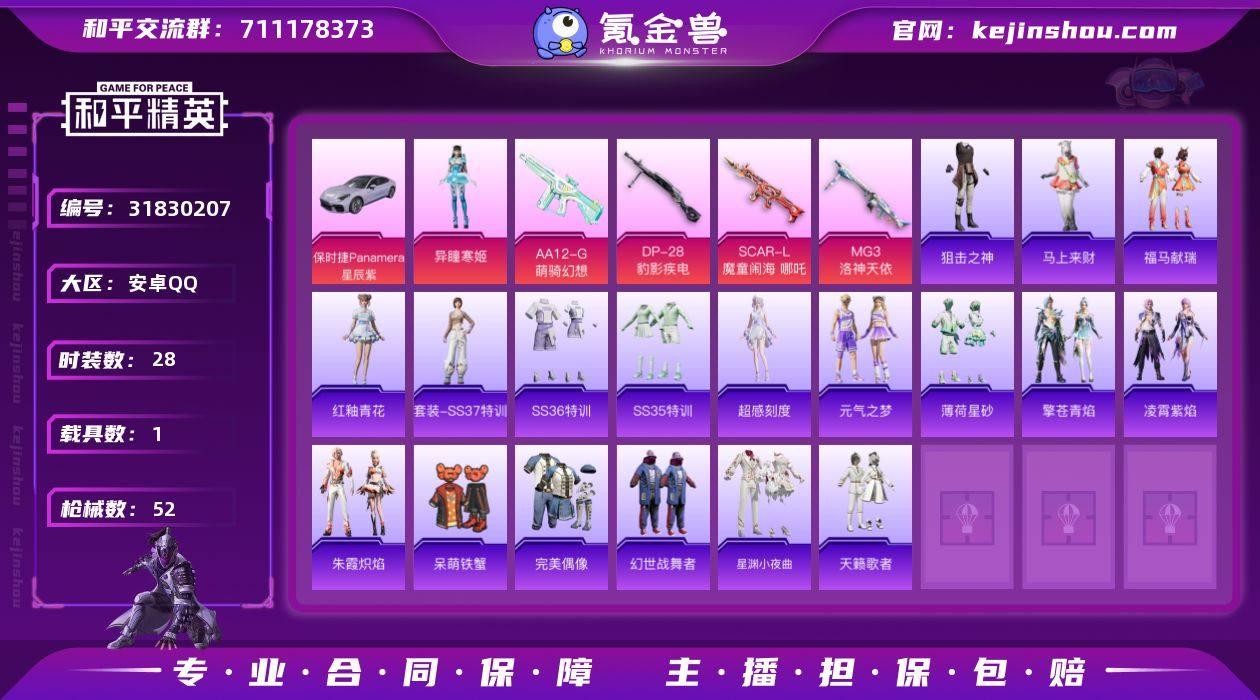 保时捷星辰紫 可改实名 2粉 5特效枪 1车 1集结舱 28套装 52枪皮 异瞳寒姬 奇迹舞步美琪 罗莉 幸运青 保时捷Panamera星辰紫 集结舱-玉虚云舱 SCAR-L-魔童闹海哪吒3级 MG3-洛神天依5级 Mk14-福马献瑞满级 DP-28-豹影疾电满级 AA12-G-萌骑幻想2级 18587热力值 N7923和平精英买号永久包赔带二次营地ID:1024208399