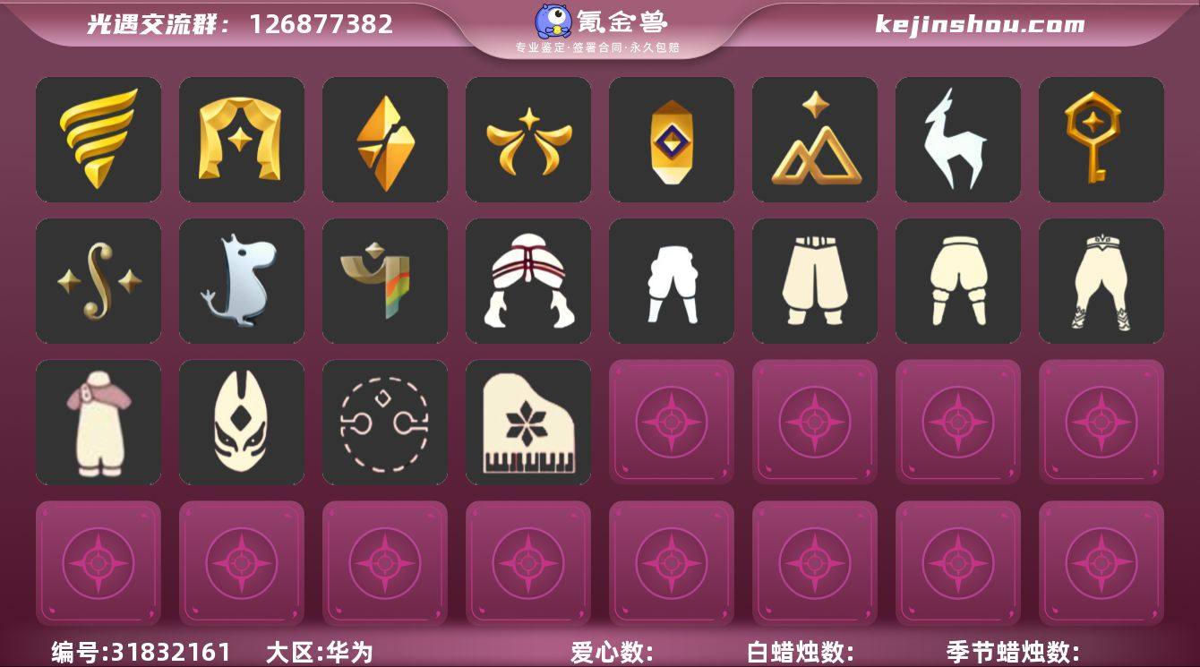 账号类型: 邮箱账号 季节已毕业: 圣岛季,预言季,破晓季,欧若拉季,集结季 完成地图: 晨岛,云野,雨林,霞谷,暮土,禁阁 珍稀物品: 鳐鲲斗篷,阿努比斯(狗头),透明蝶翼斗 礼包: 蝙蝠套,巫师,围巾,星球斗,小狐狸,绊爱,鹿角,秋千,茶桌,跷跷板,吉他,橘子,贝壳,红伞,南瓜,雪花,星月头饰,彩虹耳机,创始人,献瑞折扇礼包 裤子: 武士裤,背带裤,搓澡巾,蓝绿裤 面具: 阿努比斯,凤凰面具,贴花面具,黄眉企鹅面具 面饰: 红耳机 项链: 围巾 发型: 若笠,虚荣,小王子发型,留辫蘑菇头 头饰: 行军锅头盔,蓝色音乐会,平顶帽 斗篷: 海洋斗,遥鲲斗篷,黄色连帽披风,冥龙斗篷 配饰: 雨伞,高音钢琴,圆鼓,蓝色手碟 亮点: 【优质装备】:预言季,阿努比斯(狗头),武士裤,圣岛季,破晓季,鳐鲲斗篷,透明蝶翼斗,欧若拉季(欧若拉),行军锅头盔(六边锅帽子)(双耳锅帽子),高音钢琴(白色高脚钢琴),集结季,蓝绿裤(高领舞服),围巾(肩带),凤凰面具,贴花面具(丛林黑面具),黄眉企鹅面具,小王子发型,留辫蘑菇头,遥鲲斗篷(双翼遥鲲斗),黄色连帽披风(连帽斗篷)(斜边队长斗篷),冥龙斗篷,圆鼓(手拍大鼓),蓝色手碟(毕业手碟),蝙蝠套(蝙蝠斗篷)(南瓜头),星球斗(星球夹克),绊爱(绊爱斗篷)(绊爱礼包),秋千(情人秋千),茶桌(花憩茶桌),跷跷板(情人跷跷板),红耳机,围巾(小王子斗篷)(小王子围巾),鹿角(圣诞鹿角),吉他(音韵吉他)(白吉他),红伞(瑞气纸伞),巫师(巫师帽),小狐狸(狐狸背包),彩虹耳机,晨岛,云野,雨林,霞谷,墓土(暮土),禁阁,若笠(箬笠),星月头饰(星月头冠),创始人(创始人斗篷),献瑞折扇礼包,南瓜(冥龙南瓜),雪花(雪花发夹),橘子(大橘大利),贝壳(贝壳发饰)