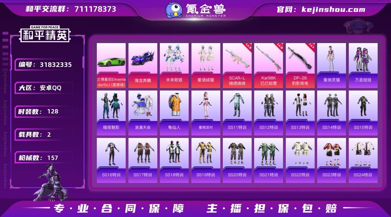 安卓 手Q-2粉装-3特效枪-2载具-1粉色飞行器-48627热力值-7王牌印记-128套装-157枪皮 【热门品类】:套装-浪漫天命,套装-龟仙人 【粉色套装】:粉装-未来歌姬,粉装-蜜语绒猫 【粉色枪皮等级】:SCAR-L-锦绣绵绵(五级),Kar98K-巳巳如意(五级),DP-28-豹影疾电(一级) 【粉色载具】:兰博基尼Aventador SVJ(翡翠绿),海龙奔腾 【粉色枪皮】:SCAR-L-锦绣绵绵,Kar98K-巳巳如意,DP-28-豹影疾电 【粉色飞行器】:炫彩糖果飞行器 【粉色降落伞】:甜心宝贝降落伞,甜蜜誓约降落伞,夏日绵绵冰降落伞,暗夜玫瑰降落伞,碧影闪光降落伞,垂柳戏鸭降落伞,彩虹甜喵降落伞,闲梦青缨降落伞,莲影清波降落伞,圣堂之誓降落伞,祥瑞锦鲤降落伞,荧海星豚降落伞,炫彩糖果降落伞 【稀有套装】:套装-龟仙人,套装-炫彩糖果,角色-蜜桃派对,角色-紫俏灵猫 【稀有枪皮】:AUG-冰晶雪宝,AKM-夜灯,AKM-彩虹符号,AKM-破晓战魂,AKM-萌趣颜团子,AKM-霓虹街区,AKM-龙的传人,M16A4-红色方程式,M16A4-蓝色火焰,SCAR-L-夜灯,SCAR-L-暗夜玫瑰,SCAR-L-炫彩节奏,SCAR-L-玉兔迎春,SCAR-L-红色方程式,M416-夜灯,M416-糯团青竹,M416-红色方程式,M416-绯红前夜,M416-蓝色火焰,GROZA-异彩先驱,GROZA-懵萌河马,AUG-天降萌叽,AUG-耀粉歌者,QBZ-彩虹符号,QBZ-神秘黑猫,QBZ-飞驰魅影,M762-天降萌叽,M762-牛气冲天,M762-瑞龙福将,M762-甜心宝贝,M762-绯红前夜,G36C-懵萌河马,G36C-暗夜玫瑰,AC-VAL-天降萌叽,AC-VAL-彩虹甜喵,AC-VAL-快闪甜心,蜜獾-天降萌叽,蜜獾-娇憨猪猪,UZI-啾咪啾咪,UZI-娇憨猪猪,UZI-炫彩节奏,UZI-烈焰拳霸,UZI-红色方程式,UMP45-夜灯,UMP45-涂山之恋,UMP45-蓝色火焰,Vector-彩虹符号,Vector-暗夜玫瑰,Vector-生命誓言,汤姆逊-天降萌叽,汤姆逊-异彩先驱,汤姆逊-耀粉歌者,...
