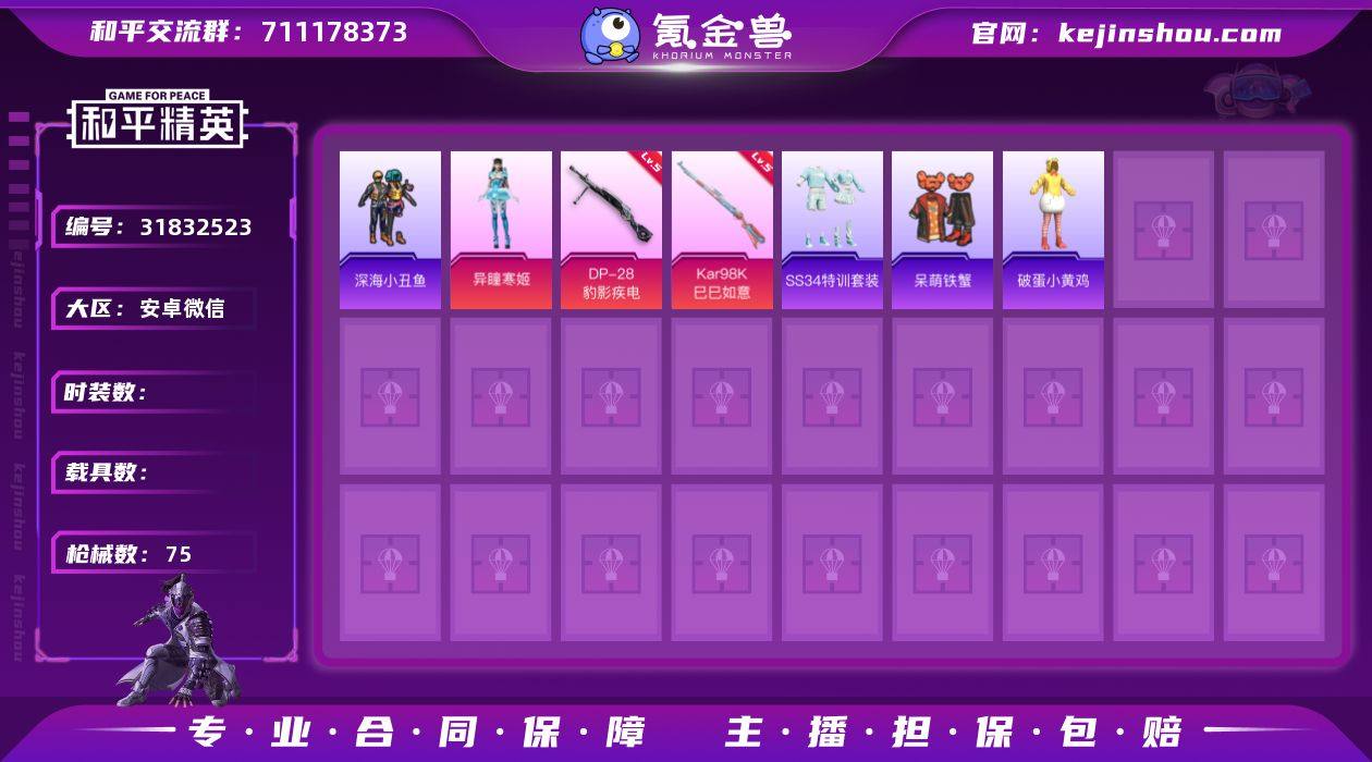 安卓微信 可二次 1粉装4特效枪48套装75枪皮 异瞳寒姬 Kar98K-巳巳如意(5级) DP-28-豹影疾电(5级) Mk14-福马献瑞(5级) UMP45-萌骑冒险(4级) 深海小丑鱼背包 呆萌铁蟹 深海小丑鱼 破蛋小黄鸡 和平精英账号