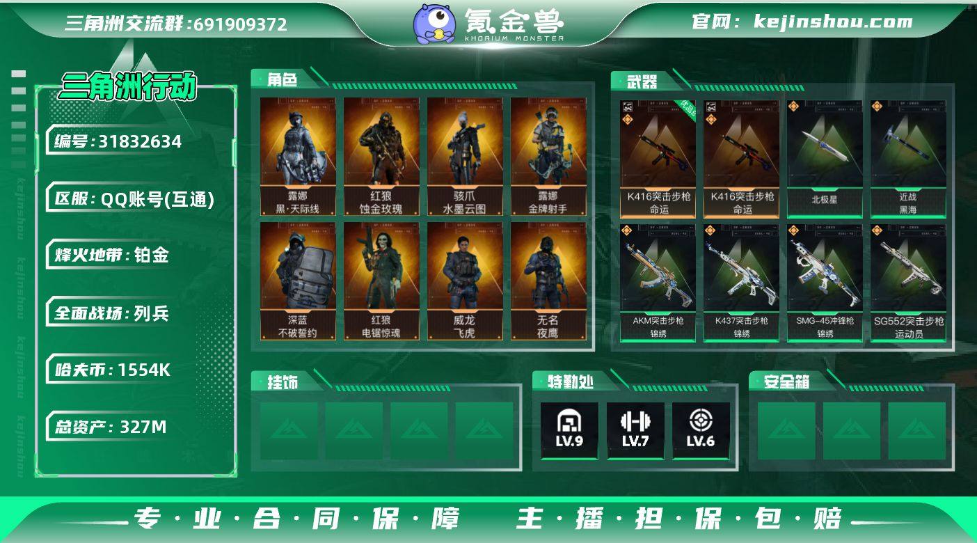 327m总资产-1554k哈伏币-60烽火等级-铂金-26战场等级-列兵 【干员外观】:红狼-蚀金玫瑰,骇爪-水墨云图,露娜-黑·天际线,威龙-飞虎,蜂医-送葬人·无题密令,无名-夜鹰,深蓝-不破誓约,红狼-电锯惊魂,露娜-金牌射手 【近战皮肤】:近战-北极星,近战-黑海,近战-黑鹰 【典藏外观】:K416突击步枪-命运 【典藏外观成色】:K416突击步枪-命运(优品B) 【传说外观】:M4A1突击步枪-蚀金玫瑰,M4A1突击步枪-阿米娅,AKM突击步枪-锦绣,ASh-12战斗步枪-鹅鸭杀,M16A4突击步枪-狩猎时刻,SG552突击步枪-运动员,AK-12突击步枪-夜鹰,AK-12突击步枪-特斯拉线圈,SCAR-H战斗步枪-水墨云图,SCAR-H战斗步枪-启航,G3战斗步枪-狩猎时刻,G3战斗步枪-骑士,CAR-15突击步枪-阿米娅,K437突击步枪-北极星,K437突击步枪-锦绣,KC17突击步枪-电锯惊魂,MP5冲锋枪-黑海,Vector冲锋枪-狩猎时刻,UZI冲锋枪-特斯拉线圈,SMG-45冲锋枪-骑士,SMG-45冲锋枪-锦绣,SR-3M紧凑突击步枪-特斯拉线圈,勇士冲锋枪-能天使-午夜邮差,QCQ171冲锋枪-北极星,QCQ171冲锋枪-鹅鸭杀,725双管霰弹枪-送葬人-无题密令,M250通用机枪-骑士之心,QJB201轻机枪-黑海,QJB201轻机枪-鹅鸭杀,R93狙击步枪-维什戴尔,G18-飞虎,复合弓-黑·天际线 【史诗外观】:AK-12突击步枪-原型机,AKM突击步枪-林中猎手,QBZ95-1突击步枪-曙光,ASh-12战斗步枪-守夜人,ASh-12战斗步枪-无极限,M16A4突击步枪-竞赛选手,AUG突击步枪-蝮蛇,M7战斗步枪-百步穿杨,SG552突击步枪-尖端治疗,SG552突击步枪-深海恐惧,SG552突击步枪-哈夫克警备,SCAR-H战斗步枪-囚徒,G3战斗步枪-流沙送葬,G3战斗步枪-哈夫克警备,AS Val突击步枪-尖端治疗,AS Val突击步枪-百步穿杨,腾龙突击步枪-无垢,K437突击步枪-守护者,MP5冲锋枪-战术竞备,MP5冲锋枪-竞技风,Vector冲锋枪-阿...