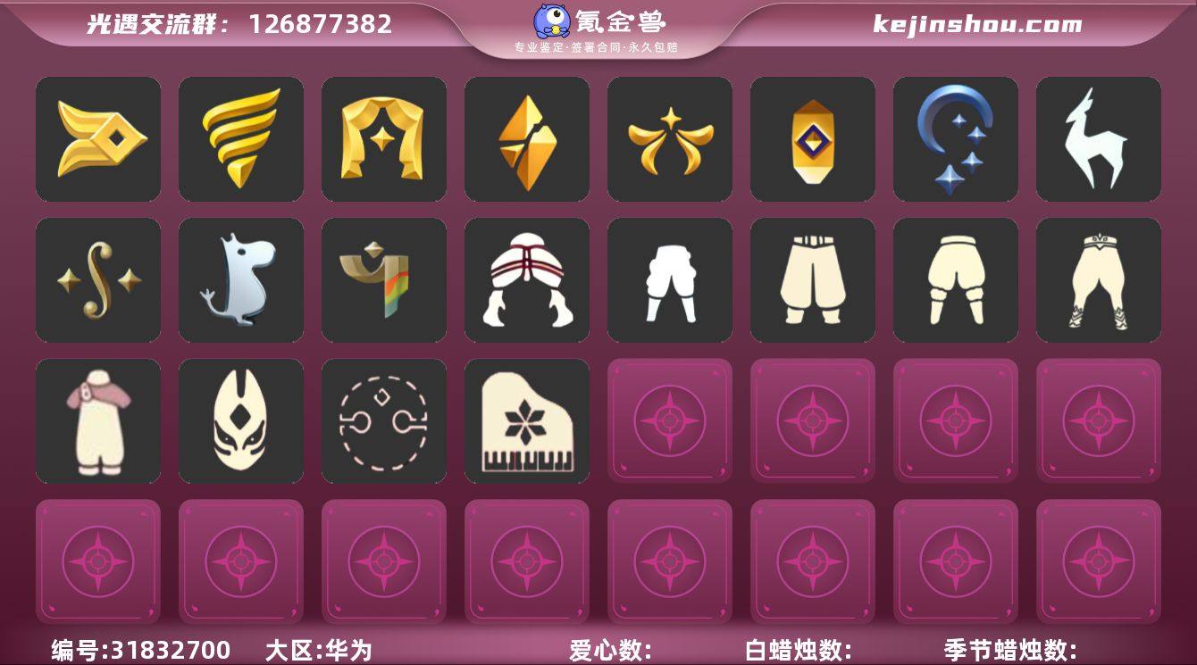 账号类型: 邮箱账号 季节已毕业: 梦想季,小王子季,风行季,表演季,破晓季,集结季,九色鹿季 完成地图: 晨岛,云野,雨林,霞谷,暮土,禁阁 珍稀物品: 白枭,玫瑰花 礼包: 巫师,围巾,小狐狸,鹿角,蜘蛛斗,茶桌,跷跷板,灯笼,橘子,贝壳,兔子,新年耳钉,创始人 裤子: 武士裤,背带裤,搓澡巾,击剑裤,王子服,风行毕业裤子 面具: 凤凰面具,黄眉企鹅面具 面饰: 红耳机 发型: 若笠,虚荣,小王子发型,飞天盘发 头饰: 行军锅头盔,羽毛发饰,蓝色音乐会,平顶帽 斗篷: 海洋斗,蟑螂斗,遥鲲斗篷,黄色连帽披风,燕尾斗篷,冥龙斗篷 配饰: 雨伞,高音钢琴,玫瑰花 亮点: 【优质装备】:表演季,白枭(帝企鹅发),武士裤,梦想季,小王子季(王子季),风行季,破晓季,行军锅头盔(六边锅帽子)(双耳锅帽子),羽毛发饰(多羽发饰),高音钢琴(白色高脚钢琴),集结季,玫瑰花,九色鹿(九色鹿季),王子服(小王子套装),蟑螂斗(凤凰斗篷),风行毕业裤子(羽袖长袍),凤凰面具,黄眉企鹅面具,小王子发型,遥鲲斗篷(双翼遥鲲斗),黄色连帽披风(连帽斗篷)(斜边队长斗篷),燕尾斗篷,冥龙斗篷,飞天盘发(九色鹿丸子头),茶桌(花憩茶桌),跷跷板(情人跷跷板),红耳机,围巾(小王子斗篷)(小王子围巾),鹿角(圣诞鹿角),蜘蛛斗(蛛丝斗篷)(蛛网斗篷),灯笼(中秋灯笼),巫师(巫师帽),小狐狸(狐狸背包),晨岛,云野,雨林,霞谷,墓土(暮土),禁阁,若笠(箬笠),创始人(创始人斗篷),兔子(玉兔头饰)(玉兔发饰)(兔子发饰),新年耳钉(金鳞耳饰),橘子(大橘大利),贝壳(贝壳发饰)