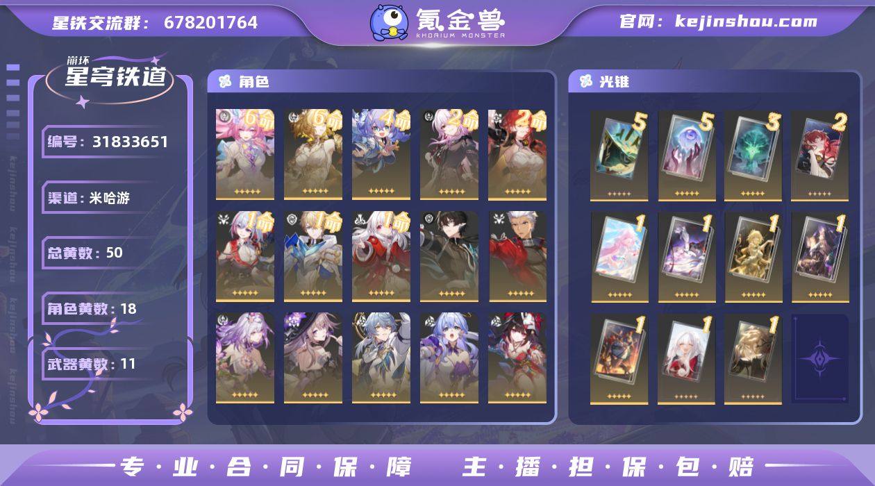 总黄数:50 五星光锥数:11 五星角色数:18 开拓等级:70 开拓者性别:女 星轨专票:0 梦华数量:0 星琼数量:107 6命昔涟,6命阿格莱雅,4命白露,2命长夜月,2命姬子,1命托帕&账账,1命杰帕德,1命克拉拉,0命丹恒·腾荒,0命Archer,0命遐蝶,0命大黑塔,0命星期日,0命知更鸟,0命花火,0命藿藿,0命刃,0命布洛妮娅 5精记忆永不落幕,5精星海巡航,3精不息的演算,2精银河铁道之夜,1精爱如此刻永恒,1精致长夜的星光,1精将光阴织成黄金,1精向着不可追问处,1精落日时起舞,1精无可取代的东西,1精如泥酣眠 换绑材料:可提供换绑材料 邮箱状态:不送邮 psn绑定情况:否 taptap绑定情况:否 卖家说:极品连体超高练度,材料圣遗无限,两个游戏超欧14连不歪,十连三金双金。多祝圣、自塑。多满命闭眼深渊,三星王棋。61昔涟(强化普攻200多w)(带弓箭皮肤),61阿格莱雅(一回合8动,一动接近200w),21长夜月(武器可以给霞蝶,自己带免费五星),周日知更鸟霍霍花火,01大黑塔月卡40多天,6仆人带柔灯或鸟枪(深渊一a68w),6基尼奇火神专武(深渊一炮170w),65闲云(深渊下落56w)31雷神21绫华,21芙宁娜11申鹤11可莉21恰斯卡11瓦蕾莎,01少女,茜特菈莉,up池垫62,31纠缠月卡70多天