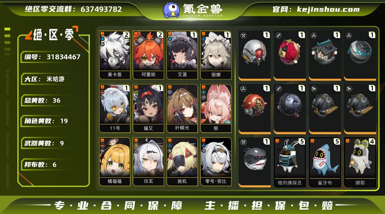 冒险等级:59 总黄数:36 五星角色数:19 菲林底片数量:467 菲林数量:1185 加密母带数量:1 2命莱卡恩,2命珂蕾妲,1命艾莲,1命丽娜,1命「11号」,1命猫又,0命叶瞬光,0命照,0命橘福福,0命仪玄,0命扳机,0命零号·安比,0命耀嘉音,0命浅羽悠真,0命星见雅,0命月城柳,0命柏妮思·怀特,0命青衣,0命格莉丝 6命潘引壶,6命波可娜,6命露西,6命苍角,6命派派,6命比利,6命本,6命安比,6命妮可,6命安东,6命可琳,5命赛斯,0命真斗 1精牺牲洁纯,1精玲珑妆匣,1精霰落星殿,1精时流贤者,1精灼心摇壶,1精啜泣摇篮,1精拘缚者,1精深海访客 5精格列佛探员,5精鲨牙布,4精狮耶,2精插头布,1精芽芽,1精飚速布 狡黠甜心,墨形影踪,漪光夜曲 卖家说:这个价格是原神➕绝区零的价格,账号是同一个,一起绑定出售的,不想玩了 价格是两个游戏绑定出售的价格