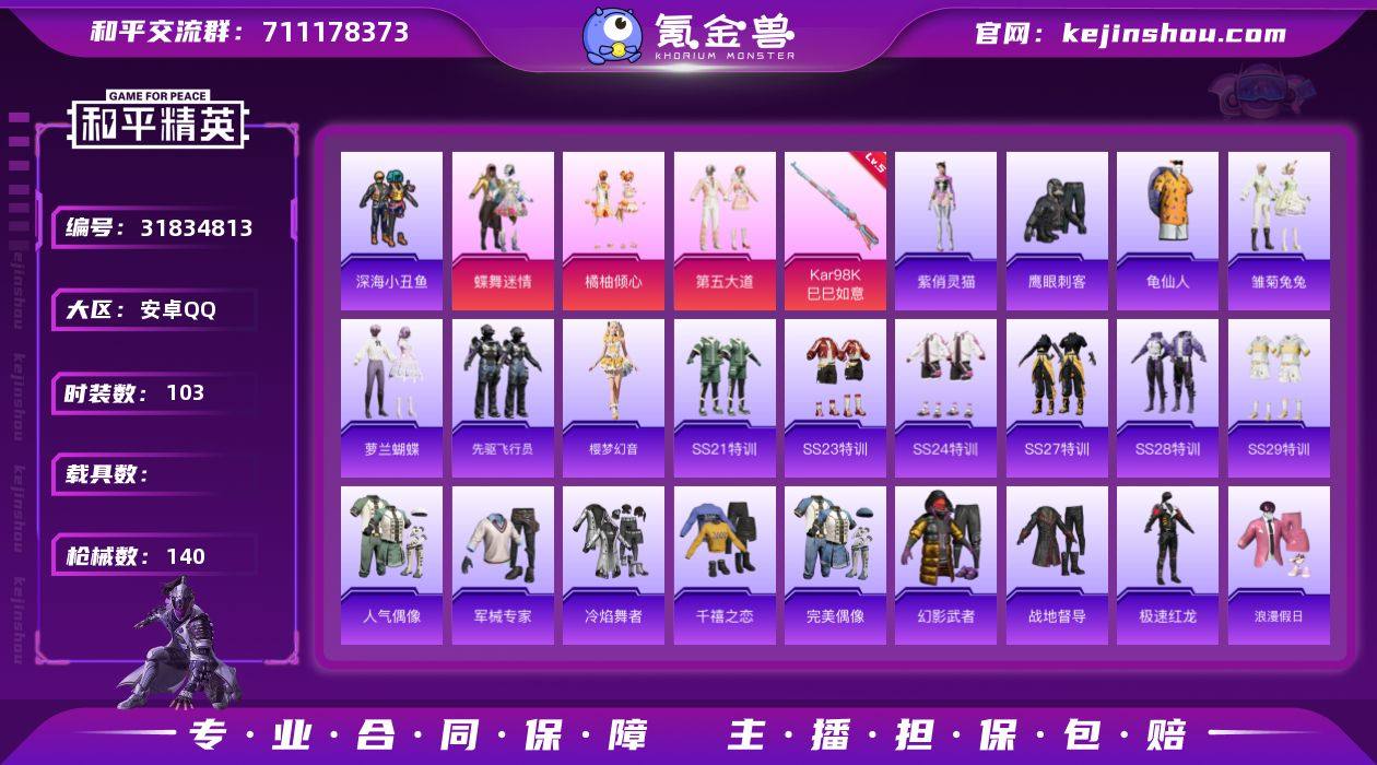 安卓 手Q-3粉装-2特效枪-0载具-1粉色飞行器-39466热力值-5王牌印记-103套装-140枪皮 【热门品类】:套装-深海小丑鱼,套装-龟仙人 【粉色套装】:粉装-蝶舞迷情,粉装-橘柚倾心,粉装-第五大道 【粉色枪皮等级】:Kar98K-巳巳如意(五级),Mk14-福马献瑞(五级) 【粉色枪皮】:Kar98K-巳巳如意,Mk14-福马献瑞 【粉色飞行器】:炫彩糖果飞行器 【粉色降落伞】:繁花小夜曲降落伞,恐龙拽拽降落伞,垂柳戏鸭降落伞,第五大道降落伞,仲夏莫吉托降落伞,飒粉甜心降落伞,未来歌姬降落伞,创世·救赎降落伞,金丰海韵降落伞,樱桃泡泡降落伞,炫彩糖果降落伞 【稀有套装】:套装-龟仙人,套装-炫彩糖果,套装-雏菊兔兔,套装-萝兰蝴蝶,套装-先驱飞行员,套装-樱梦幻音,角色-紫俏灵猫 【稀有枪皮】:AUG-冰晶雪宝,AKM-2P战斗服款,AKM-江南烟雨,AKM-破晓战魂,AKM-龙的传人,SCAR-L-夜灯,SCAR-L-炫彩节奏,SCAR-L-玉兔迎春,SCAR-L-繁花小夜曲,M416-红色方程式,GROZA-彩虹符号,GROZA-懵萌河马,AUG-天降萌叽,AUG-耀粉歌者,M762-天降萌叽,M762-快乐主宰,Mk47-妙红点点,Mk47-炫光之旅,Mk47-虹云熊熊,G36C-懵萌河马,AC-VAL-天降萌叽,蜜獾-天降萌叽,蜜獾-娇憨猪猪,UZI-啾咪啾咪,UZI-娇憨猪猪,UZI-金玉无双,UMP45-仲夏莫吉托,UMP45-涂山之恋,UMP45-猪猪侠,UMP45-粉色回忆,UMP45-蓝色火焰,UMP45-金玉无双,Vector-焰鹰斗篷,Vector-生命誓言,Vector-音爆索尼克,Vector-创世·救赎,汤姆逊-天降萌叽,汤姆逊-花间之火,MP5K-怪笑疯兔,MP5K-繁花小夜曲,MP5K-飒粉甜心,Kar98K-彩虹符号,M24-未来战士,AWM-焰鹰斗篷,AWM-垂柳戏鸭,AWM-音爆索尼克,SKS-炫彩节奏,VSS-繁花小夜曲,Mini14-旋转彩虹,Mini14-耀粉歌者,Mini14-阿狸红,SLR-娇憨猪猪,莫辛纳甘-懵萌河马,AMR-妙红点点,M417-惊鸿侠...