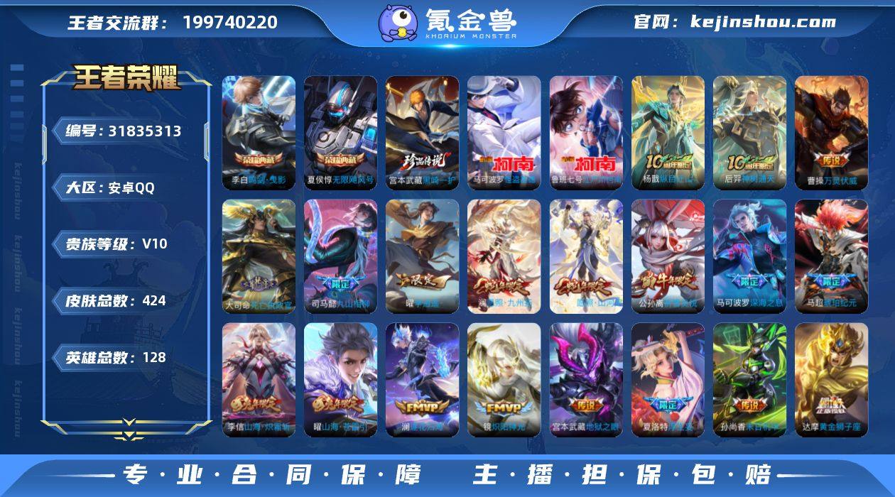 【6440】实名: 可修改 贵族等级: V10 珍品传说3 典藏2 传说47 史诗118 限定150 英雄127 皮肤419 稀有英雄10 贵族10级 总场次16558 皮肤价值:339406 【珍品传说3】 宫本武藏黑崎一护 鲁班七号江户川柯南 马可波罗怪盗基德