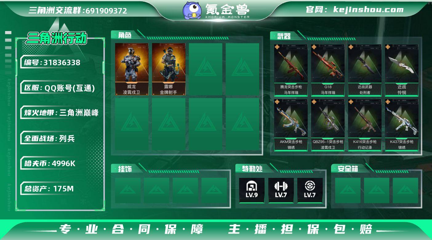 175m总资产-4996k哈伏币-60烽火等级-三角洲巅峰-16战场等级-列兵【干员外观】:威龙-凌霄戍卫,露娜-金牌射手【近战皮肤】:近战-怜悯,近战-处刑者,近战-黑鹰【传说外观】:AKM突击步枪-锦绣,QBZ95-1突击步枪-凌霄戍卫,K416突击步枪-行动记录,SG552突击步枪-运动员,SCAR-H战斗步枪-荼蘼,腾龙突击步枪-马年祥瑞,K437突击步枪-锦绣,SMG-45冲锋枪-锦绣,SR-3M紧凑突击步枪-荼蘼,PKM通用机枪-荼蘼,M14射手步枪-蛮荒,M14射手步枪-缄花,SKS射手步枪-骑士,SR-25射手步枪-缄花,.357左轮-缄花,G18-马年祥瑞【史诗外观】:Vector冲锋枪-潜袭者,K416突击步枪-冬日风情,K416突击步枪-腊梅,K416突击步枪-阿萨拉特攻,AUG突击步枪-蝮蛇,M7战斗步枪-百步穿杨,G3战斗步枪-流沙送葬,AS Val突击步枪-百步穿杨,腾龙突击步枪-猎鳄行动,MP5冲锋枪-竞技风,Vector冲锋枪-百步穿杨,Vector冲锋枪-异域战争,SMG-45冲锋枪-阿萨拉特攻,SR-3M紧凑突击步枪-开工大吉,勇士冲锋枪-丛影谍踪,MP7冲锋枪-六套之力,M249轻机枪-丛影谍踪,M250通用机枪-囚徒,QJB201轻机枪-炽焰,VSS射手步枪-丛影谍踪,M14射手步枪-工业狂潮, M14射手步枪-航天庆典,M700狙击步枪-百步穿杨,M700狙击步枪-哈夫克警备,AWM狙击步枪-流沙送葬【稀有外观】:UZI冲锋枪-旧梦,M4A1突击步枪-繁盛,AKM突击步枪-肃杀,ASh-12战斗步枪-繁盛,K416突击步枪-一帆风顺,SG552突击步枪-2026,SG552突击步枪-马年新春,SG552突击步枪-贴花艺术, AK-12突击步枪-马年新春,G3战斗步枪-主宰,G3战斗步枪-猛禽,CAR-15突击步枪-来财,KC17突击步枪-来财,MP5冲锋枪-弄臣,MP5冲锋枪-哈夫克卫队,Vector冲锋枪-先锋,SMG-45-行动开启,SR-3M紧凑突击步枪-马年新春,勇士冲锋枪-主宰,勇士冲锋枪-冰天雪地,MP7冲锋枪-钢铁之躯,M249轻机枪-冰天雪地,QJ...