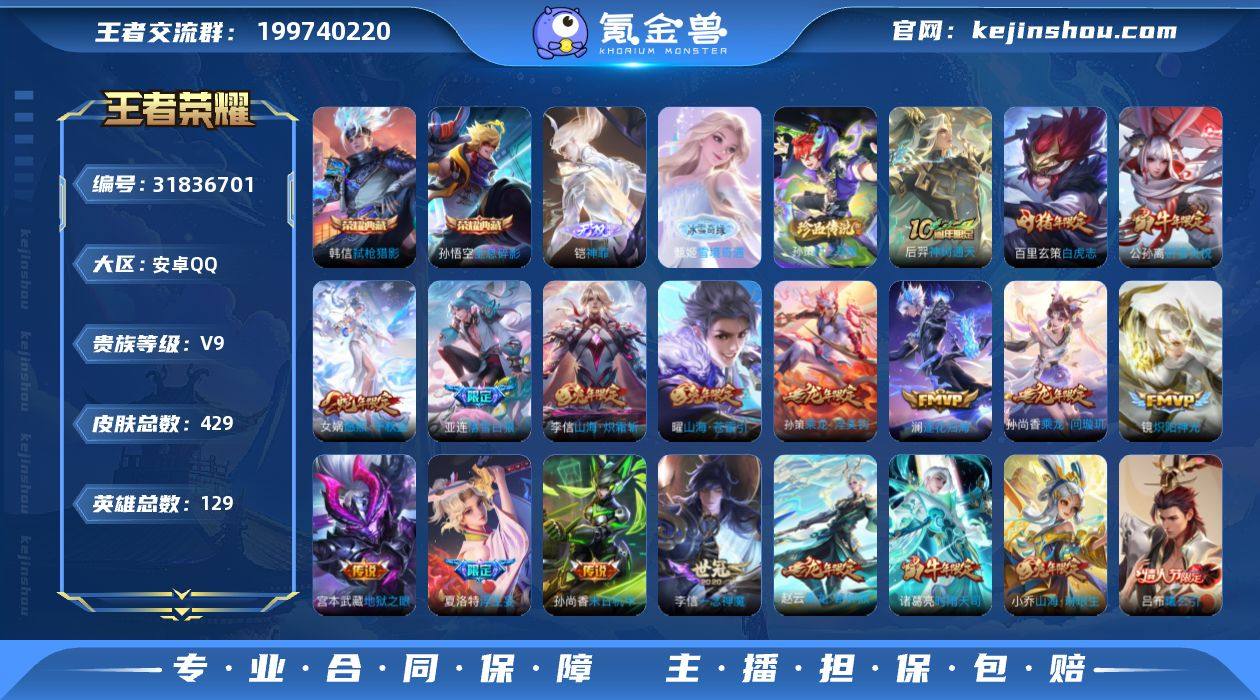 安卓Q-V9-至尊星耀III段位-129英雄-429皮肤-2典藏皮肤-1典藏英雄-2无双-1珍品传说-36传说-127史诗【英雄全皮】:嬴政全皮,孙权全皮,鬼谷子全皮,猪八戒全皮,敖隐全皮,空空儿全皮,影全皮【荣耀典藏】:武则天英雄,孙悟空全息碎影,韩信弑枪猎影【无双皮肤】:甄姬雪境奇遇,铠神罪【珍品传说】:孙策时之奇旅【传说皮肤】:后羿神树通天,女娲愿照千秋盛,云缨幻光神枪,嬴政玄雷天君,亚连落雪白狼,吕布曦玄引,貂蝉曦玄引,孙尚香乘龙问璇玑,孙策乘龙淬吴钩,赵云乘龙铭钟鼎,澜逐花归海,夏洛特浮生妄,孙悟空齐天大圣,小乔山海琳琅生,曜山海苍雷引,李信山海炽霜斩,李白诗剑行,孙尚香音你闪耀,孙策挚爱之约,王昭君乞巧织情,小乔音你心动,公孙离祈雪灵祝,诸葛亮时雨天司,铠绛天战甲,镜炽阳神光,虞姬启明星使,李信一念神魔,张良黄金白羊座,干将莫邪久胜战神,百里玄策白虎志,花木兰冠军飞将,孙尚香末日机甲,宫本武藏地狱之眼,孙悟空地狱火,武则天海洋之心,狄仁杰超时空战士【限定皮肤】:姜子牙天穹之誓,狄仁杰阴阳师,廉颇寅虎御盾,小乔山海琳琅生,赵云皇家上将,墨子神迹守卫,墨子降魔,嬴政优雅恋人,嬴政白昼王子,鲁班七号狮舞东方,庄周高山流水,高渐离死亡摇滚,阿轲迷踪丽影,钟无艳超时空战士,白起夜都怪侠,芈月重明,芈月幻夜卜梦,吕布猎兽之王,吕布御风骁将,周瑜赤莲之焰,元歌云间偶戏,元歌无心,夏侯惇朔风刀,甄姬落雪兰心,曹操烛龙,典韦穷奇,典韦蓝屏警告,马可波罗暗影游猎,马可波罗山海玄木吟,狄仁杰魔术师,狄仁杰万华元夜,达摩星际陆战队,达摩沙漠行僧,项羽海滩派对,老夫子醍醐杖,老夫子航海奇遇记,程咬金演武夺筹,刘邦夺宝奇兵,韩信傲雪梅枪,兰陵王驯魔猎人,兰陵王金庭之子,花木兰默契交锋,亚瑟潮玩骑士王,孙悟空至尊宝,孙悟空...
