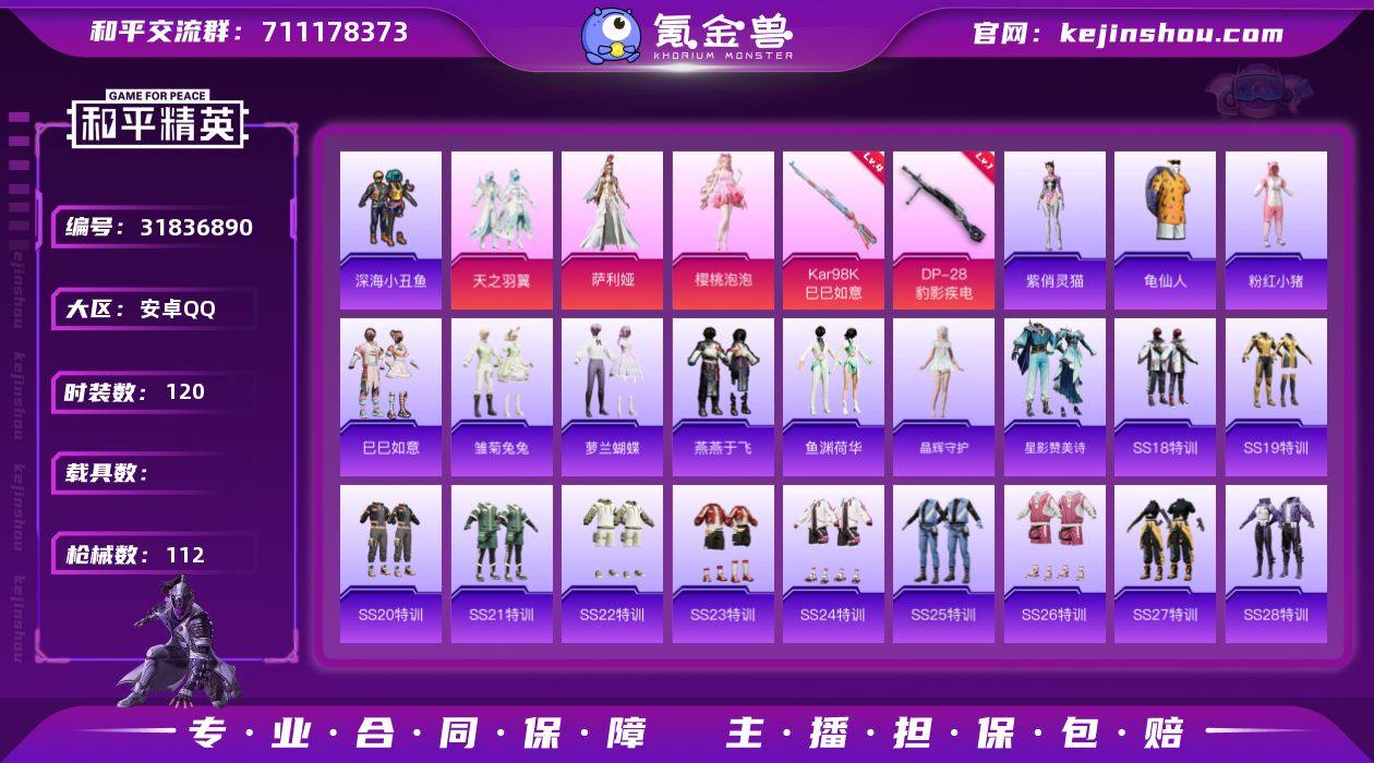 安卓 手Q-3粉装-2特效枪-0载具-0粉色飞行器-35538热力值-5王牌印记-120套装-112枪皮 【热门品类】:套装-深海小丑鱼,套装-龟仙人,套装-粉红小猪 【粉色套装】:粉装-天之羽翼,角色-萨利娅,角色-樱桃泡泡 【粉色枪皮等级】:Kar98K-巳巳如意(四级),DP-28-豹影疾电(一级) 【粉色枪皮】:Kar98K-巳巳如意,DP-28-豹影疾电 【粉色降落伞】:庄周梦蝶降落伞,第五大道降落伞,蜜语绒猫降落伞,星穹咏叹调降落伞 【稀有套装】:套装-龟仙人,套装-巳巳如意,套装-雏菊兔兔,套装-萝兰蝴蝶,套装-燕燕于飞,套装-鱼渊荷华,套装-晶辉守护,套装-星影赞美诗,角色-紫俏灵猫 【稀有枪皮】:AKM-小鹦鹉BEBE,AKM-彩虹符号,AKM-破晓战魂,AKM-龙的传人,M16A4-幻世战舞者,M16A4-蓝色火焰,SCAR-L-玉兔迎春,SCAR-L-红色方程式,M416-糯团青竹,M416-红色方程式,M416-蓝色火焰,GROZA-彩虹符号,AUG-天降萌叽,AUG-耀粉歌者,M762-天降萌叽,M762-萌物绒绒,AC-VAL-天降萌叽,AC-VAL-快闪甜心,Famas-月下星之子,UMP45-生命誓言,UMP45-蓝色火焰,Vector-焰鹰斗篷,Vector-生命誓言,汤姆逊-天降萌叽,汤姆逊-炫彩节奏,汤姆逊-耀粉歌者,P90-快闪甜心,Kar98K-炫彩节奏,Kar98K-红色方程式,M24-炫彩节奏,AWM-焰鹰斗篷,SKS-苔丝玫瑰,Mini14-春暖花开,莫辛纳甘-蜜语绒猫,M417-惊鸿侠骨,MK20-H-快闪甜心,M200-仲夏莫吉托,M200-惊鸿侠骨,S686-彩虹符号,S686-生命誓言,S686-红色方程式,S686-千金淑猫,S12K-破晓战魂,S12K-音爆索尼克,S12K-幻世战舞者,S12K-智耀战神,DBS-焰鹰斗篷,M249-彩虹符号,M249-破晓战魂,DP-28-焰鹰斗篷,MG3-幻世战舞者,MG3-惊鸿侠骨,PKM-蜜语绒猫,蝎式手枪-虹云熊熊,蝎式手枪-千金淑猫,沙漠之鹰-快闪甜心,爆炸猎弓-惊鸿侠骨 【其他套装】:套装-SS18特训,套装-SS19特...