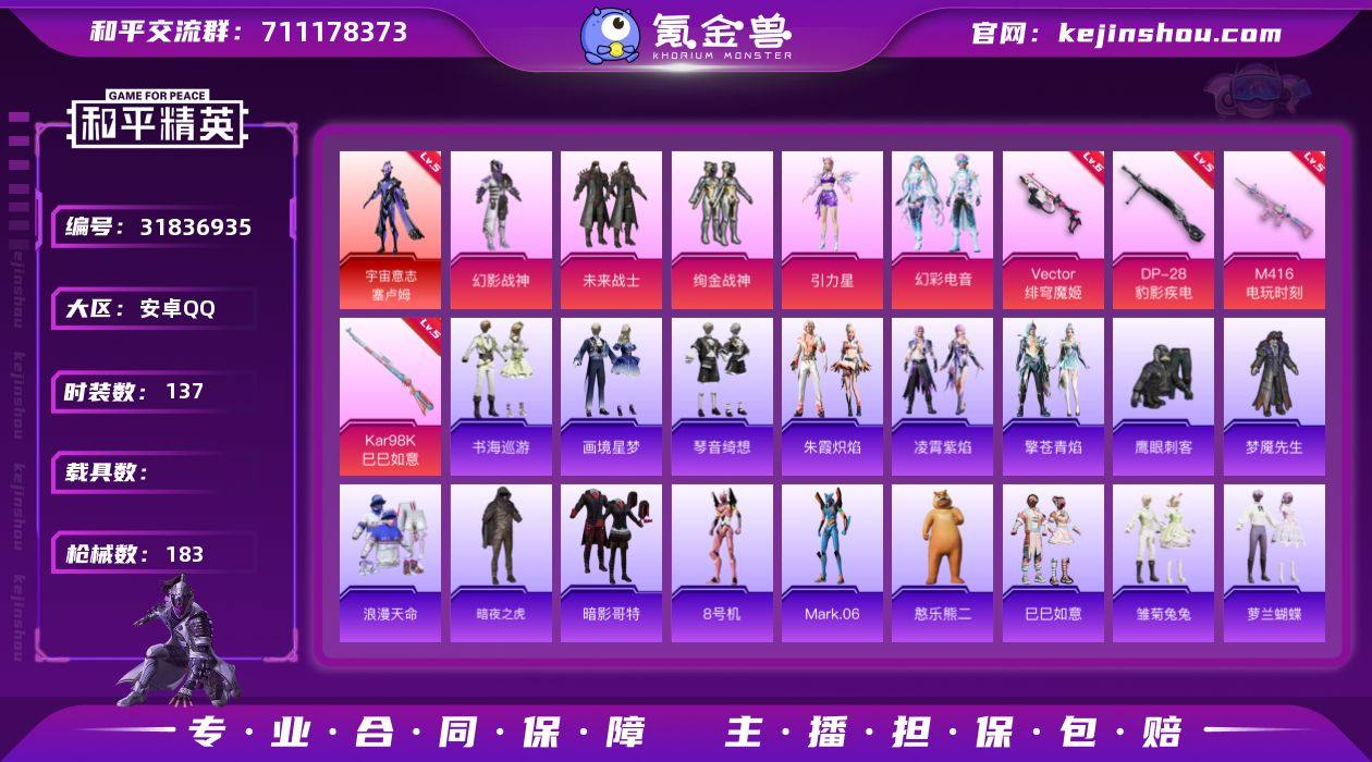 安卓 手Q-5粉装-11特效枪-1载具-1粉色飞行器-57454热力值-12王牌印记-110套装-192枪皮 【热门品类】:套装-浪漫天命,套装-都市猎人,套装-深海小丑鱼,套装-小丑鱼,角色-军刀雅典娜,套装-暗影哥特 【粉色套装】:粉装-炙焰红王,角色-洛天依,粉装-赤焰黑爵,角色-复仇流浪者,角色-凤凰座 一辉 【粉色枪皮等级】:SCAR-L-童趣迷兔(五级),M416-五爪金龙(七级),AUG-星之彼岸(四级),UMP45-相思残雪(五级),Vector-环太平洋(五级),AKS-74U-森灵之息(三级),Kar98K-巳巳如意(五级),DP-28-豹影疾电(五级) 【粉色载具】:玛莎拉蒂Quattroporte(夜幕蓝) 【粉色枪皮】:SCAR-L-童趣迷兔,M416-五爪金龙,AUG-星之彼岸,UMP45-相思残雪,Vector-环太平洋,AKS-74U-森灵之息,Kar98K-巳巳如意,Mk14-福马献瑞,AA12-G-萌骑幻想,DP-28-豹影疾电 【粉色飞行器】:极意拳锋飞行器 【粉色降落伞】:梦幻火箭降落伞,童趣迷兔降落伞,星之彼岸降落伞,相思残雪降落伞,洛神天依降落伞,蓝莓炮弹降落伞,绚金瑰梦降落伞,冷魅冰骑降落伞,筑梦精灵降落伞,炙焰牛王降落伞,妙趣可丽降落伞,环太平洋降落伞,垂柳戏鸭降落伞,星梦奇缘降落伞,临安公主降落伞,星穹咏叹调降落伞,冷漠罗丽降落伞,荧海星豚降落伞,喜羊羊与灰太狼降落伞,异瞳寒姬降落伞,炫彩糖果降落伞 【稀有套装】:套装-巳巳如意,角色-许七安,套装-燕燕于飞,套装-鱼渊荷华,角色-糖霜甜心,套装-萌萌史莱姆,套装-云朵鹅,套装-雪绒豹,套装-朱霞炽焰,套装-凌霄紫焰,套装-擎苍青焰,套装-雨过天青,套装-红釉青花 【稀有枪皮】:AKM-彩虹符号,AKM-影袭,AKM-星之彼岸,AKM-环太平洋,AKM-虎虎生威,AKM-霓虹街区,M16A4-幻世战舞者,M16A4-甜心亚梦,SCAR-L-炫彩节奏,SCAR-L-玉兔迎春,SCAR-L-红色方程式,M416-夜灯,M416-暗夜行者,M416-月...
