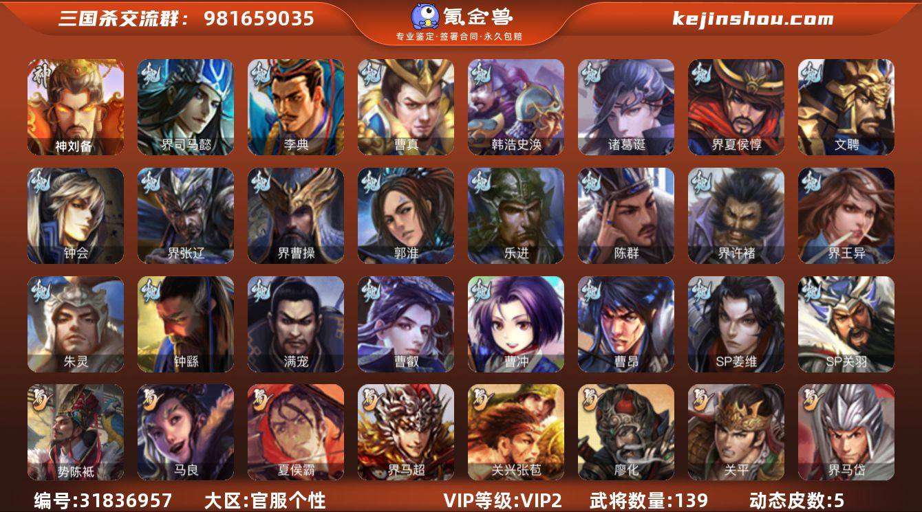 【14789230】官阶:先锋将军;VIP等级:VIP2;史诗武将数量:4;动态皮肤数量:5;武将总数:139;史诗宝珠数量:0;将魂数量:3356;神将:1;魏国史诗武将:2;蜀国史诗武将:0;吴国史诗武将:1;群史诗武将:1