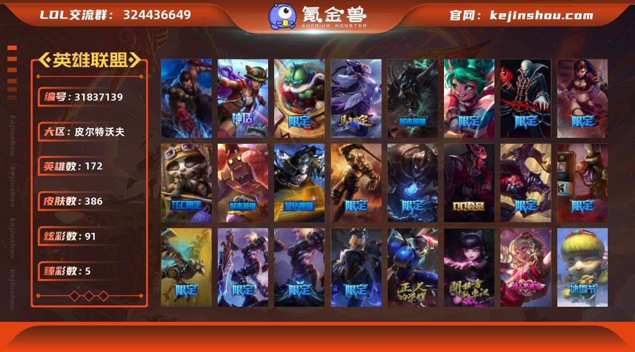 t36103【皮尔特沃夫】386皮肤 91炫彩 5臻彩 3神话/65限定/15传说/172英雄 账号等级:871 【重要头像】水晶圣骑蕾欧娜头 【重要皮肤】水晶圣骑蕾欧娜 胜利行刑官德莱文 胜利剑圣易 胜利女神娑娜 胜利之王泰达米尔 胜利巨口克格莫 哥特萝莉安妮 荣誉使者玛尔扎哈 安妮梦游仙境 电玩女神厄运小姐 定海神珍孙悟空 广寒仙子嫦娥 胜利女神瑟庄妮 胜利之树茂凯 胜利机器人布里茨 甜心宝贝安妮 圣诞糖果棒厄运小姐 灵魂收割者索拉卡 泳池派对雷克顿 SKTT1雷克顿 SSW雷恩加尔 SSW图奇 SSW辛吉德 SKTT1劫 SKTT1婕拉 暗杀星蒙多 暗杀星努努和威朗普 暗杀星伊泽瑞尔 Fnatic嘉文四世 冰雪节玛尔扎哈 冰雪兽纳尔 防暴士兵辛吉德 防暴天使凯尔 钢铁之翼艾尼维亚 冠军之刃锐雯 冠军之刃锐雯2016 冠军之血希瓦娜 红桃杰克崔斯特 胡桃夹子萨科 警用试作体K9内瑟斯 蓝色忧郁崔斯特 蒙多蒙多 密林猎手提莫 南瓜头费德提克 女猎手希维尔 圣诞精灵崔丝塔娜 圣诞开心鬼提莫 圣诞狂欢基兰 圣诞狂欢努努和威朗普 圣诞老人古拉加斯 圣诞玩偶波比 圣诞驯鹿克格莫 外星装甲库奇 喜庆之树茂凯 幸福女神乐芙兰 雪默丁格 英勇玩具兵普朗克 暗影沃里克 机械迷城加里奥 诺斯费拉图弗拉基米尔 阿木木主人不要我了 波比的巧克力工坊 都铎王朝图奇 十五周年纪念希维尔 神凰行者瑞羽圣凰艾尼维亚 胜利凤凰艾尼维亚 暗裔英雄盖伦 灵魂守卫乌迪尔 【传说皮肤】枯萎之壤泽拉斯 金牌主播德莱文 战场女武神凯尔 泳池派对吉格斯 女皇艾希 源计划林易 魔幻卡牌崔斯特 苹果机器人布里茨 绅士科加斯 红色男爵库奇 电玩女神娑娜 大天使长米迦勒凯尔 欧米伽小队幽灵特工 第三类接触黑默丁格 黯黑魔龙希瓦娜 【重要炫彩】赵云子龙炫金将军 神龙尊者圣龙李青登龙 净雪之月莫甘娜冬虹 暗影沃里克至真至诚 西部魔影赫卡里姆拜恩之势 天龙之子卡莎飞龙乘云