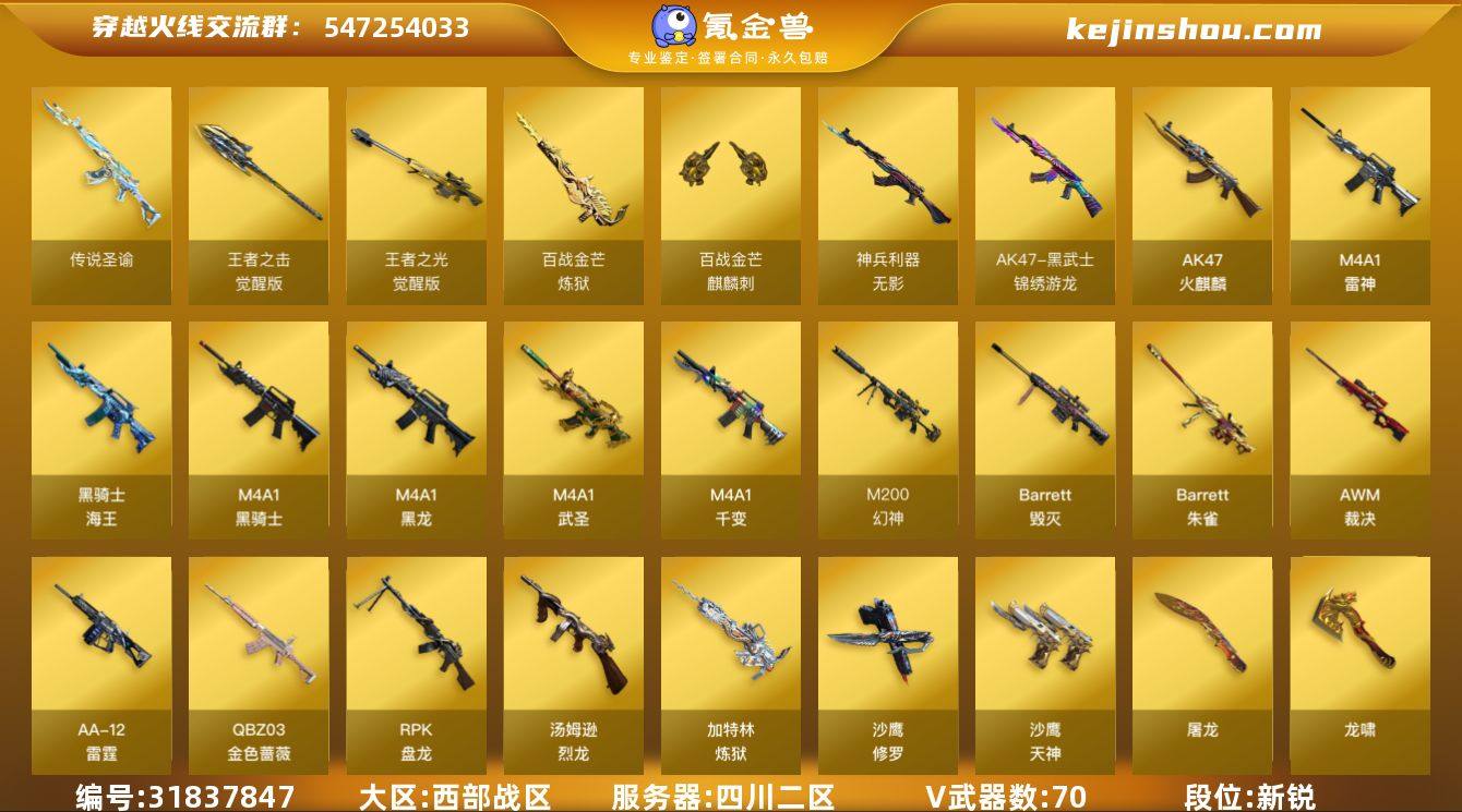 四川二区-75V-2王者武器数-0炫金武器数 【传说武器】:传说圣谕 【传说角色】:传说星骇 【热门武器】:传说圣谕,QBZ03-金色蔷薇,M200-幻神,死亡之眼,M4A1-黑骑士,汤姆逊-烈龙*6,RPK-盘龙,加特林-炼狱,斯泰尔-蝴蝶,沙鹰-修罗*4 【音效卡】:M200-幻神音效卡,M4A1-黑骑士音效卡,Barrett-毁灭音效卡,AWM-裁决音效卡,沙鹰-修罗-盛典舞曲音效卡*2,Barrett-碧霄极光音效卡,炼狱-百战金芒-庆典舞曲音效卡 【皮肤】:AWM-裁决-凤灵皮肤,M4A1-再燃火线,雷神-神秘按键 皮肤,火麒麟-雷神,火麒麟-平天大圣,火麒麟-心动糖果,毁灭-黑大圣皮肤,毁灭-航天科技皮肤,毁灭-英雄计划 皮肤,M4A1-千变-孔明皮肤,黑骑士-暗月,战神-粉色甜心皮肤,战神-紫绶金章皮肤,AK47-B-常胜将军-曹操*2,AK47-B-常胜将军-孙权*2,天龙-能量核心,AWM-天龙-传奇白鲨,炼狱-星空,轻型军用手斧-再燃火线 【角色】:葵,樱,王者玲珑-小乔,暗夜-X,北极狐-X,初恋灵狐,风暴女,嘉年华灵狐,娟娟,灵狐者-黄金海岸,曼陀罗-X,潘多拉-X,潘多拉-甜心教官,潜龙队-X,邱刚敖,青霞仙子,斯沃特-X,蜀雪,铁骑荣耀,兔囡囡,新娜塔莎,影武者-X 【人偶武器】:斯泰尔-蝴蝶,AWM-灵狐-15周年嘉年华*2,迷你深渊冰龙*3,迷你裂空之翼*5,夺魂,迷你牛牛*3,迷你生化手雷*2,深渊终结者手雷*3,闪光弹-貂蝉,高爆手雷-大乔,迷你艾比,灵狐娃娃手雷 【暴走生化】:死亡之眼,超级对讲机 【挑战大师】:神圣爆裂者III*2,AK47-冰龙粉碎者*3,冰龙粉碎者-白马银枪,激光毁灭者III-白马银枪,激光毁灭者III*2,机甲撕裂者III,神圣爆裂者-末日III*2,阐释者III,VEPR-12-紫魔 【英雄级武器】:M4A1-千变,AK47-火麒麟*2,M4A1-黑龙,M4A1-雷神*2,M4A1-黑骑士,M4A1-武圣,无影-神兵利器,黑武士-锦绣游龙,QBZ03-金色蔷薇,黑骑士-...