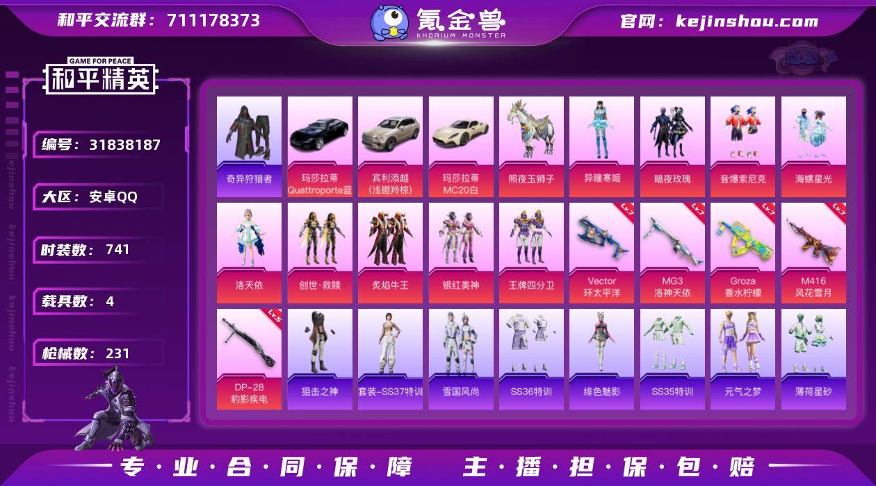 实名:可二次实名 是否支持人脸包赔:支持 粉装数量:9 特效枪数量:5 载具数:4 时装数:741 枪械数:231 奇异狩猎者 异瞳寒姬,暗夜玫瑰,创世·救赎,炙焰牛王,海螺星光,洛天依,王牌四分卫,音爆索尼克,银红美神 七级Groza-香水柠檬,七级M416-风花雪月,七级MG3-洛神天依,七级Vector-环太平洋,五级DP-28-豹影疾电 玛莎拉蒂Quattroporte(夜幕蓝),宾利添越(浅瞪羚棕),玛莎拉蒂MC20(星石白),照夜玉狮子 狙击之神,SS37特训,雪国风尚,SS36特训,奇异狩猎者,绯色魅影,SS35特训,元气之梦,薄荷星砂,凌霄紫焰,SS34特训套装,朱霞炽焰,冰川格斗者,缤纷果语,暴风机械师,缤纷焰火,北国孤狼,白光莹,滨海假日,白兰地假日,壁垒格斗者,冰爽海盐,贝斯之夜,醇脆可可,岑岑玉浪,春光漫游,长空猛禽,潮流先锋,潮流游乐家,春日漫步,晨曦薄雾,呆萌铁蟹,登山爱好者,飞驰魅影,绯格组合,飞狐塔尔斯,粉红小猪,疯狂小兔子,风行保卫者,福星高照,飞行日记,诡面顽熊,龟仙人,光之冒险,海滨突袭者,幻彩翩翩,鹤鸣,鹤发童颜,虎虎生威吉莉,荷畔雨呱,灰色格斗者,灰色守护者,海上生明月,幻世战舞者,和煦暖阳,军刀雅典娜,金戈铁马,金环蜂王,惊鸿侠骨,娇憨猪猪,竞技达人朋克,击剑大师,竞技名士,竞技勇士朋克,吉莉礼服,坚韧舞者,军械专家,锦衣飞扬,酷潮明星,科技之星,快闪甜心,空投萌叽,龙的传人,蓝海鲸歌,猎梦纪元,灵蜜圈圈,蓝色守护者,龙腾端午,冷焰舞者,妙红点点,梦幻奶油,萌黄之夏,麻辣教官,懵萌河马,萌趣咩咩,萌趣颜团子,弄潮海豚,霓虹极客,霓虹街区,怒火燎原,柠萌假日,牛气冲天,牛气满满,暖心熊熊,破蛋小黄鸡,朋克治安官,青春冒险家,青春校园,轻风白浪,青龙圣者,绮丽涂鸦,青丘仙客,青涩时光,骑行爱好者,瑞龙福将,荣耀,燃烧卡路里,热血青春,圣诞大吉,深海格斗者,水晶王族,时空追击者,沙漠兵团,沙漠探路者,沙漠雄狮,神气柴柴,帅气教官,SS10特训,SS12特训,SS13特训,SS14特训,SS15特训,SS16特训,SS17特训,SS18特训,SS19特训,SS20特训,SS21特训,SS22特训,SS23特训,SS24特训,SS25特训,SS26特训,SS27特训,SS28特训,SS29特训,SS30特训套装,SS32特训套装,SS33特训套装,SS5特训,SS6特训,SS7特训,SS8特训,SS9特训,探宝勇士,天籁歌者,甜蜜熊情侣,甜梦熊熊,涂山之恋,甜心亚梦,突袭者,团圆交子,田园牧歌,特种颜团子,特战装甲,完美偶像,王牌教练,西部风情,星辰守护者,迅捷之星,绚烂繁星,炫蓝之夏,星梦畅游,迅猛虎鲸,骁骑迪迦,夏日音浪,醒狮腾龙,雪兔飞飞,虚音幻奏,迎春赐吉,熠彩粉晶,异彩先驱,跃动心情,耀粉歌者,荧惑魅影,雨林探路者,音速流光,玉兔迎春,野性山猫,野性战魂,野性战心,英勇保护者,耀眼新星,战地名士,战地菁英,忠猛周仓,棕色飞行服,忠义严颜,治愈之星 歌者泠鸢飞行器,太空嘟嘟飞行器,庄周梦蝶飞行器,喜羊羊与灰太狼降落伞,暗夜鎏金降落伞,暗夜玫瑰降落伞,创世·救赎降落伞,繁花小夜曲降落伞,怪笑疯兔降落伞,环太平洋降落伞,精灵梦叶罗丽降落伞,极限特训降落伞,恐龙拽拽降落伞,蓝莓炮弹降落伞,洛神天依降落伞,青空秋雨降落伞,千面幻镜降落伞,太空嘟嘟降落伞,童趣迷兔降落伞,天之羽翼降落伞,闲梦青缨降落伞,香水柠檬降落伞,旋转彩虹降落伞,音爆索尼克降落伞,夜幕颂歌降落伞,银刃赛罗降落伞,筑梦精灵降落伞,仲夏莫吉托降落伞