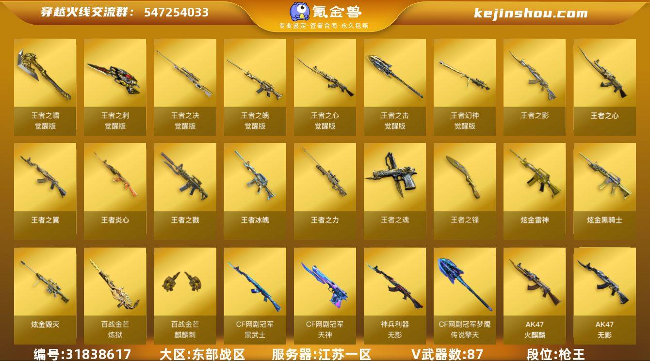 江苏一区-93V-28王者-3炫金 【热门武器】:QBZ03-金色蔷薇,HK417-朱雀,M4A1-青龙,M200-幻神,死亡之眼*2,王者炎心,M4A1-黑骑士,汤姆逊-烈龙*6,RPK-盘龙,加特林-炼狱*2,斯泰尔-蝴蝶,羊驼玩偶,沙鹰-修罗*2,金刚伞 【王者炫金武器】:王者冰魄,王者炎心,王者之戮,王者之翼,王者之影,王者之心,王者之力,王者之魂,王者之锋,炫金骑士,炫金雷神,炫金毁灭,王者之魄高爆手雷*2,王者之魄闪光弹*2,王者之魄烟雾弹*2 【音效卡】:M200-幻神音效卡,M4A1-雷神音效卡,M4A1-黑骑士音效卡,Barrett-毁灭音效卡,炼狱-百战金芒-庆典舞曲音效卡 【皮肤】:幻神-电竞之星 皮肤,白虎-百战金芒 皮肤,AWM-裁决-凤灵皮肤,雷神-星空,雷神-宇航兔皮肤,M4A1-再燃火线,雷神-神秘按键 皮肤,火麒麟-雷神,毁灭耀金皮肤,毁灭-战神张飞,毁灭-虹光风暴 皮肤,毁灭-英雄计划 皮肤,M4A1-千变-孔明皮肤,黑龙-能量核心,M4A1-黑龙-361,黑骑士-暗月,无影-能量核心,无影-霓裳皮肤,AK47-黑武士-361,天启-暗月,战神-粉色甜心皮肤*2,战神-紫绶金章皮肤*2,战神-流金岁月皮肤,AK47-B-常胜将军-曹操*2,AK47-B-常胜将军-刘备*2,AK47-B-常胜将军-孙权,修罗-能量核心,修罗-星空,天神-暗月,轻型军用手斧-再燃火线 【角色】:葵,魅影,炫,迷迭香,王者-瞳-闭月羞花,王者零-华冠丽服,王者-葵-貂蝉,王者-零,王者春,王者玲珑,王者-魅影,王者-迷迭香,王者玲珑-小乔,乔伊教练,修道士,暗夜-X,芳心审判者,风暴女*2,嘉年华灵狐,娟娟,龙儿,麻雀,潘多拉-X,潘多拉-甜心教官,邱刚敖,青霞仙子,蜀雪,铁骑荣耀,兔囡囡,新娜塔莎,雪莉杨,雪莉杨-摸金校尉,樱-缤纷夏日,影武者-X,雅典娜 【人偶武器】:斯泰尔-蝴蝶,AWM-灵狐-15周年嘉年华,迷你深渊冰龙,迷你生化手雷*3,生化手雷-机甲核心,深...