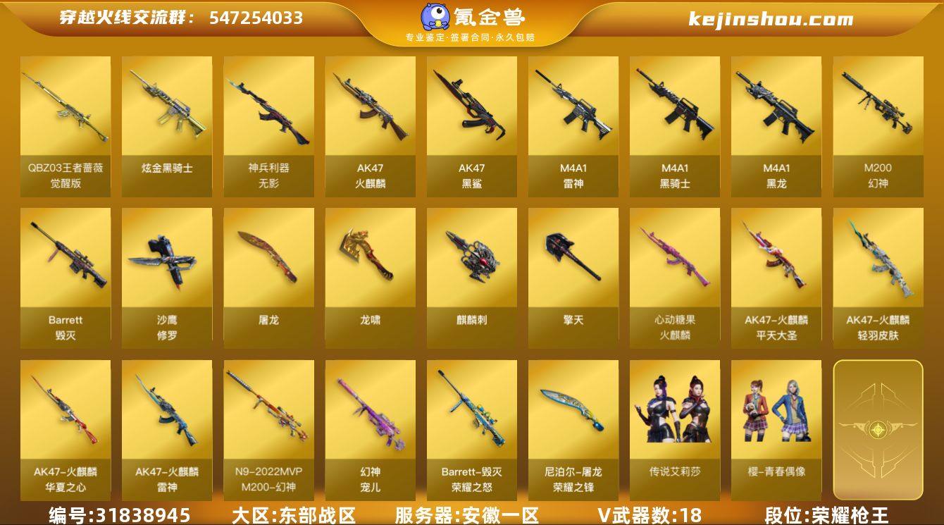 安徽一区-25V-2王者武器数-1炫金武器数 【传说角色】:传说艾莉莎 【热门武器】:M200-幻神,M4A1-黑骑士,沙鹰-修罗,金刚伞 【王者炫金武器】:炫金骑士 【音效卡】:Scar Light-白虎音效卡,枪娘语音包-阿敏 【皮肤】:幻神-宠儿-2021MVP,M200-幻神-N9-2022MVP,火麒麟-雷神,火麒麟-华夏之心,火麒麟-轻羽皮肤,火麒麟-平天大圣,火麒麟-心动糖果,毁灭-荣耀之怒,毁灭-虹光风暴 皮肤,屠龙-荣耀之锋 【角色】:奇洋探员,乔伊教练,云海玲珑,芳心审判者,嘉年华灵狐,娟娟,0号玩家,麻雀,潘多拉-X,潘多拉-甜心教官,斯沃特-X,樱-青春偶像 【人偶武器】:AWM-灵狐-15周年嘉年华,COP-旗袍,迷你深渊冰龙,迷你牛魔王,迷你波特博士,生化手雷-机甲核心,深渊终结者手雷,Barrett-夜玫瑰,迷你艾比 【挑战大师】:激光毁灭者III-白马银枪,神圣爆裂者-末日III 【英雄级武器】:AK47-火麒麟,M4A1-黑龙,M4A1-雷神*2,M4A1-黑骑士,AK47-黑鲨,无影-神兵利器,QBZ-03-王者蔷薇-觉醒版,白虎之魄-觉醒版,Barrett-毁灭,M200-幻神,沙鹰-修罗,屠龙*2,龙啸,擎天,麒麟刺 【道具】:全能枪王背包,女皇终结者-魔龙之吻,绿色巨人,灵魂忍者,迷雾幽灵,夺命之镰,防化服*2,金色流光-枪王排位*2,星辰流光-枪王排位,防弹头盔*3,防弹衣*3,C4工具钳*3,手雷包*3 【特殊枪械】:1黑骑士