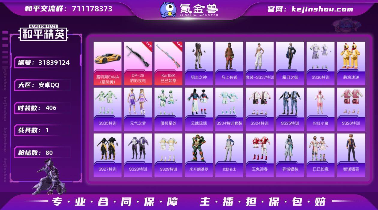 【2特效枪1载具】 安卓Q区-26794热力值-7印记-101套装-80枪皮 【1载具】 路特斯EVIJA(星际黄)【2特效枪】 DP-28-豹影疾电(5级) Kar98K-巳巳如意(5级)【5热门】 极速红龙 狂沙舞者 MG3-乌木金纹 Kar98K-彩虹符号 M416-糯团青竹 营地ID:904117314